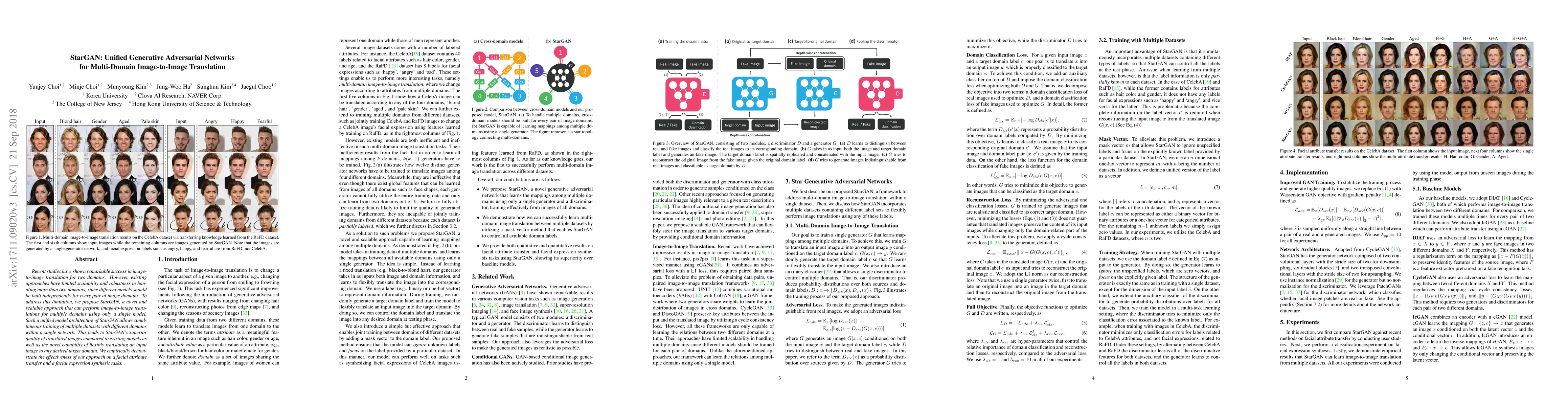 Recent studies have shown remarkable success in image-to-image translation for two domains. However, existing approaches have limited scalability and robustness in handling more than two domains, since different models should be built independently for every pair of image domains. To address this limitation, we propose StarGAN, a novel and scalable approach that can perform image-to-image translations for multiple domains using only a single model. Such a unified model architecture of StarGAN allows simultaneous training of multiple datasets with different domains within a single network. This leads to StarGAN's superior quality of translated images compared to existing models as well as the novel capability of flexibly translating an input image to any desired target domain. We empirically demonstrate the effectiveness of our approach on a facial attribute transfer and a facial expression synthesis tasks.