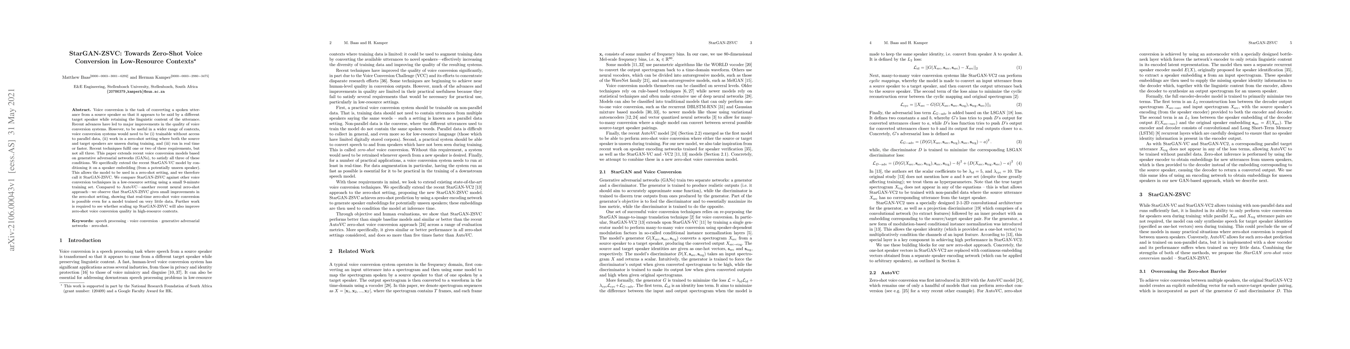 The paper extends StarGAN-VC by conditioning it on a speaker embedding from potentially unseen speakers, enabling zero-shot voice conversion. The model, called StarGAN-ZSVC, is trained on a 9-minute subset of the VCC dataset and compared to other voice conversion techniques in a low-resource setting.