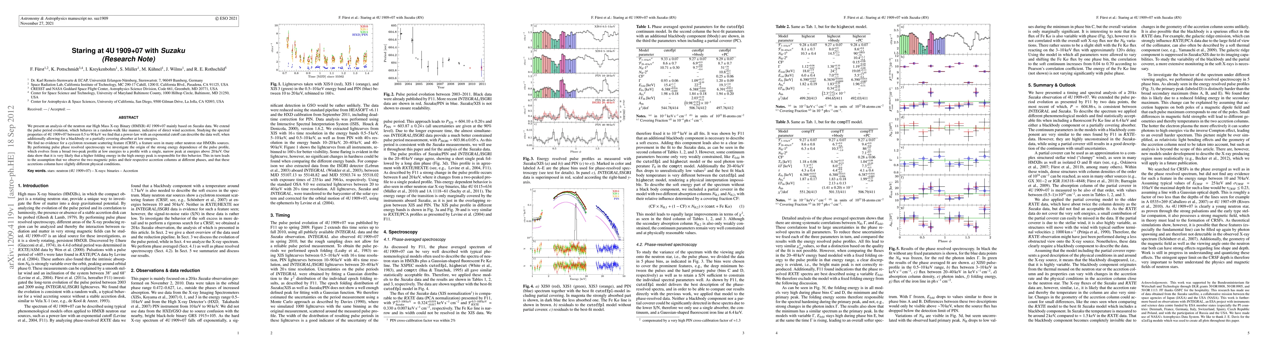 We present an analysis of the neutron star High Mass X-ray Binary (HMXB) 4U 1909+07 mainly based on Suzaku data. We extend the pulse period evolution, which behaves in a random-walk like manner, indicative of direct wind accretion. Studying the spectral properties of 4U 1909+07 between 0.5 to 90 keV we find that a power-law with an exponential cutoff can describe the data well, when additionally allowing for a blackbody or a partially covering absorber at low energies. We find no evidence for a cyclotron resonant scattering feature (CRSF), a feature seen in many other neutron star HMXBs sources. By performing pulse phase resolved spectroscopy we investigate the origin of the strong energy dependence of the pulse profile, which evolves from a broad two-peak profile at low energies to a profile with a single, narrow peak at energies above 20 keV. Our data show that it is very likely that a higher folding energy in the high energy peak is responsible for this behavior. This in turn leads to the assumption that we observe the two magnetic poles and their respective accretion columns at different phases, and that these accretions column have slightly different physical conditions.