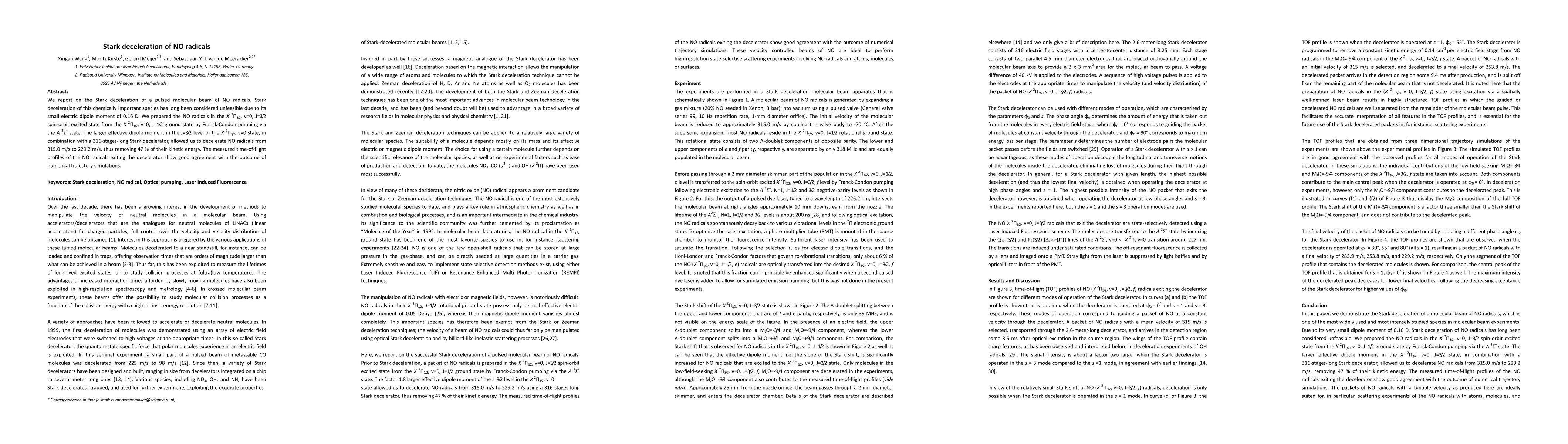 We report on the Stark deceleration of a pulsed molecular beam of NO radicals. Stark deceleration of this chemically important species has long been considered unfeasible due to its small electric dipole moment of 0.16 D. We prepared the NO radicals in the X 2{\Pi}3/2, v=0, J=3/2 spin-orbit excited state from the X 2{\Pi}1/2, v=0, J=1/2 ground state by Franck-Condon pumping via the A 2{\Sigma}+ state. The larger effective dipole moment in the J=3/2 level of the X 2{\Pi}3/2, v=0 state, in combination with a 316-stages-long Stark decelerator, allowed us to decelerate NO radicals from 315.0 m/s to 229.2 m/s, thus removing 47 % of their kinetic energy. The measured time-of-flight profiles of the NO radicals exiting the decelerator show good agreement with the outcome of numerical trajectory simulations.