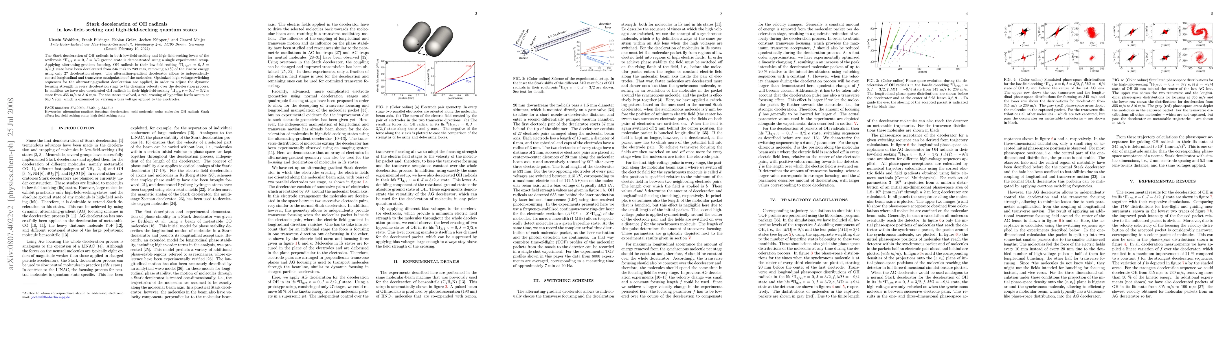 This paper demonstrates the Stark deceleration of OH radicals in both low-field-seeking and high-field-seeking states using an alternating-gradient decelerator, achieving significant kinetic energy reduction in both states through optimized high-voltage sequences.