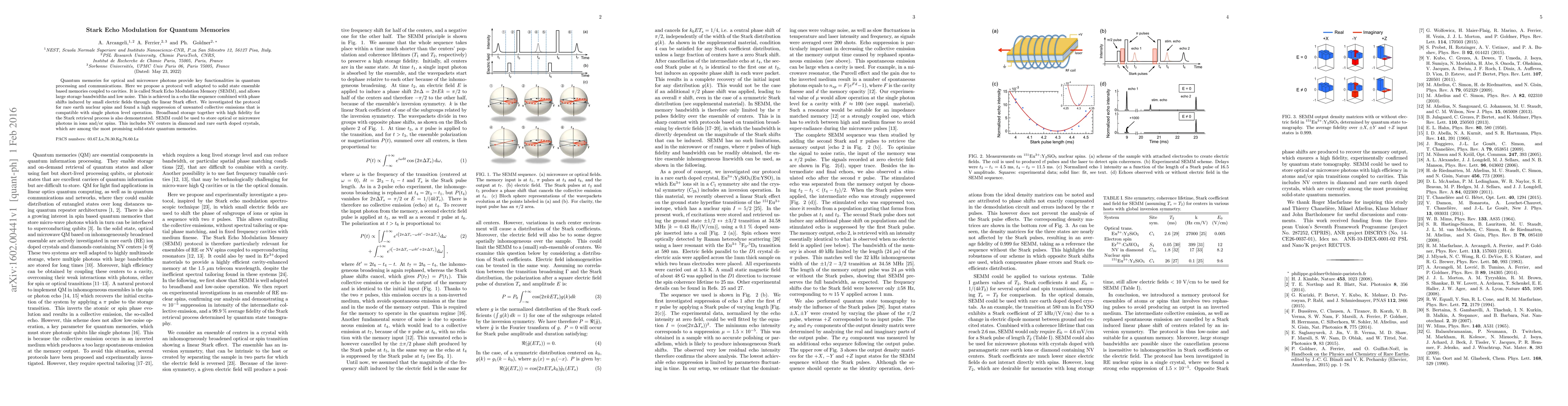 This paper proposes a Stark Echo Modulation Memory (SEMM) protocol for solid-state quantum memories, achieving large storage bandwidths and low noise through an echo-like sequence and linear Stark effect. The protocol demonstrates high fidelity and suppression of collective emissions, making it suitable for single photon level operations in systems like NV centers and rare earth doped crystals.