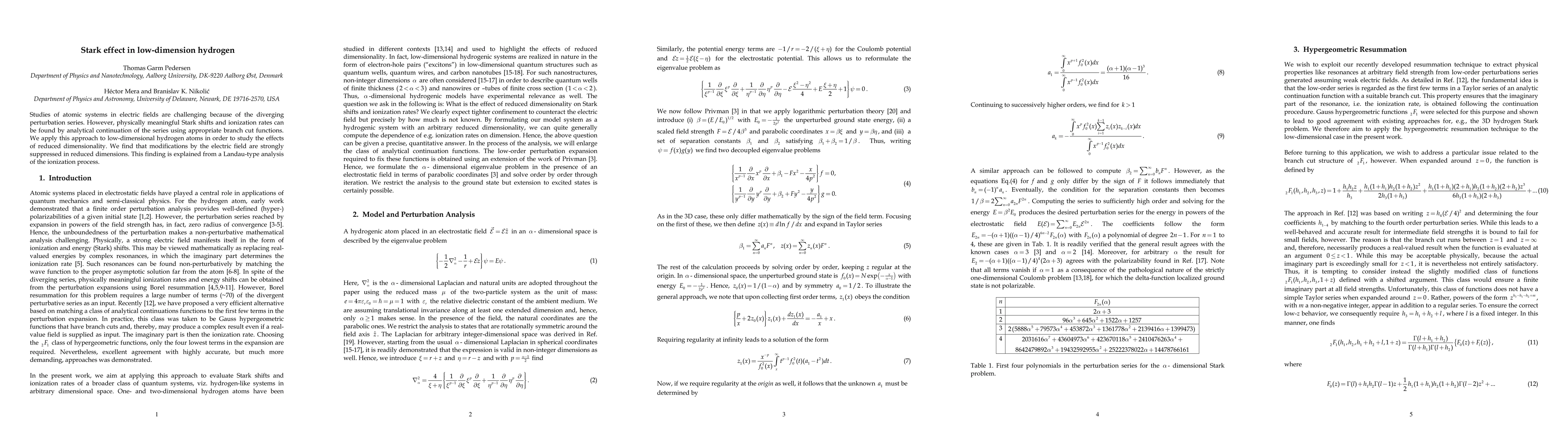Studies of atomic systems in electric fields are challenging because of the diverging perturbation series. However, physically meaningful Stark shifts and ionization rates can be found by analytical continuation of the series using appropriate branch cut functions. We apply this approach to low-dimensional hydrogen atoms in order to study the effects of reduced dimensionality. We find that modifications by the electric field are strongly suppressed in reduced dimensions. This finding is explained from a Landau-type analysis of the ionization process.