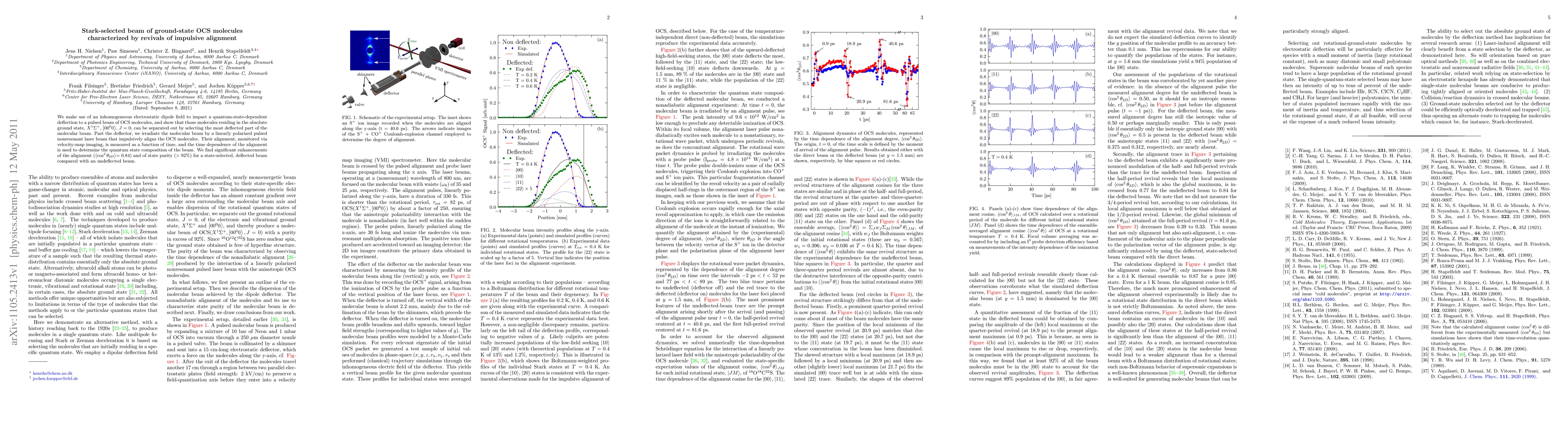 We make use of an inhomogeneous electrostatic dipole field to impart a quantum-state-dependent deflection to a pulsed beam of OCS molecules, and show that those molecules residing in the absolute ground state, $X ^1\Sigma^+$, $\ket{00^00}$, J=0, can be separated out by selecting the most deflected part of the molecular beam. Past the deflector, we irradiate the molecular beam by a linearly polarized pulsed nonresonant laser beam that impulsively aligns the OCS molecules. Their alignment, monitored via velocity-map imaging, is measured as a function of time, and the time dependence of the alignment is used to determine the quantum state composition of the beam. We find significant enhancements of the alignment (\costhetasqtd $= 0.84$) and of state purity ($> 92$%) for a state-selected, deflected beam compared with an undeflected beam.