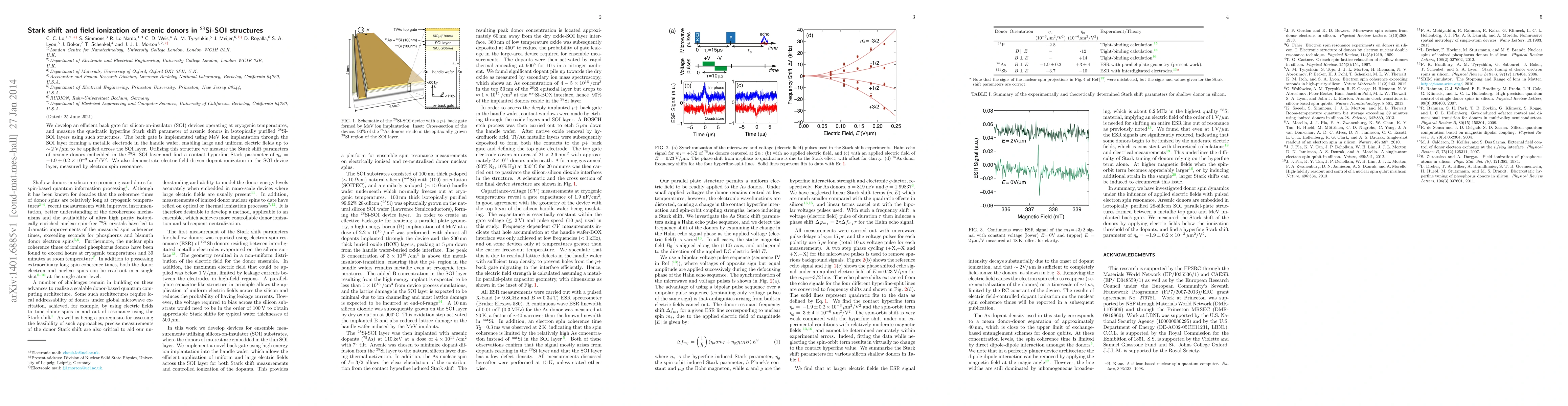 This research develops a cryogenic back gate for silicon-on-insulator devices, measuring the quadratic hyperfine Stark shift of arsenic donors in $^{28}$Si-SOI layers, finding a Stark parameter of $\eta_a=-1.9\pm0.2\times10^{-3} \mu$m$^2$/V$^2$, and demonstrating electric-field driven dopant ionization via electron spin resonance.