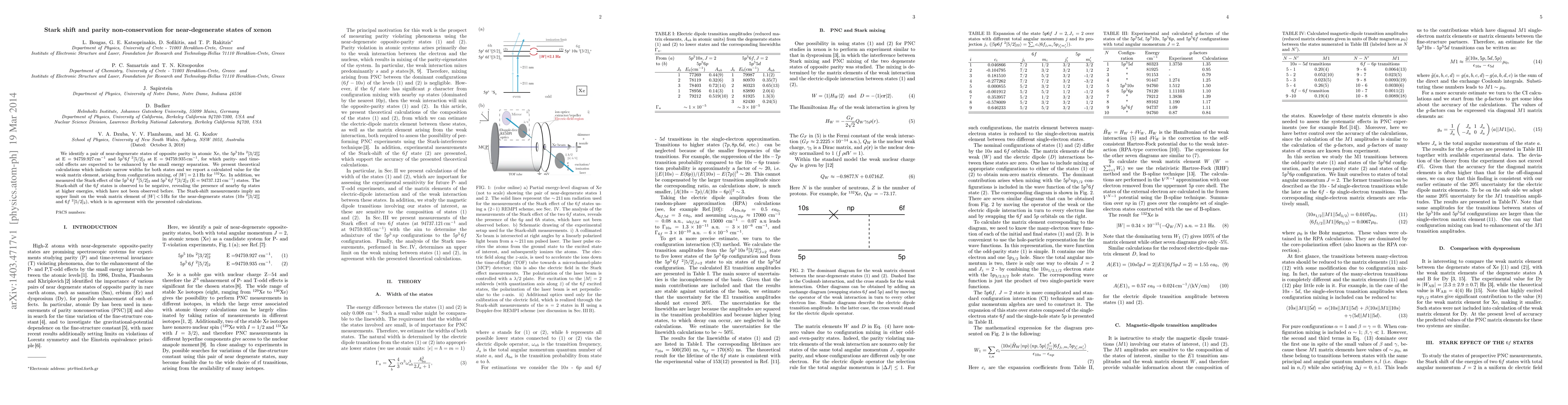 We identify a pair of near-degenerate states of opposite parity in atomic Xe, the $5p^5 10s \,\, ^2[3/2]_2^o$ at $\rm{E}=94759.927$ cm$^{-1}$ and $5p^5 6f \,\, ^2[5/2]_2$ at $\rm{E}= 94759.935$ cm$^{-1}$, for which parity- and time-odd effects are expected to be enhanced by the small energy separation. We present theoretical calculations which indicate narrow widths for both states and we report a calculated value for the weak matrix element, arising from configuration mixing, of $|W|=2.1$ Hz for $^{132}$Xe. In addition, we measured the Stark effect of the $5p^5\,6f$ $^2[5/2]_{2}$ and $5p^5 \,6f \ ^2[3/2]_2$ ($\rm{E} =94737.121\,\rm{cm}^{-1}$) states. The Stark-shift of the $6f$ states is observed to be negative, revealing the presence of nearby $6g$ states at higher energies, which have not been observed before. The Stark-shift measurements imply an upper limit on the weak matrix element of $|W|\!<\!5$ Hz for the near-degenerate states ($10s \,\, ^2[3/2]_2^o$ and $6f \,\, ^2[5/2]_2$), which is in agreement with the presented calculations.