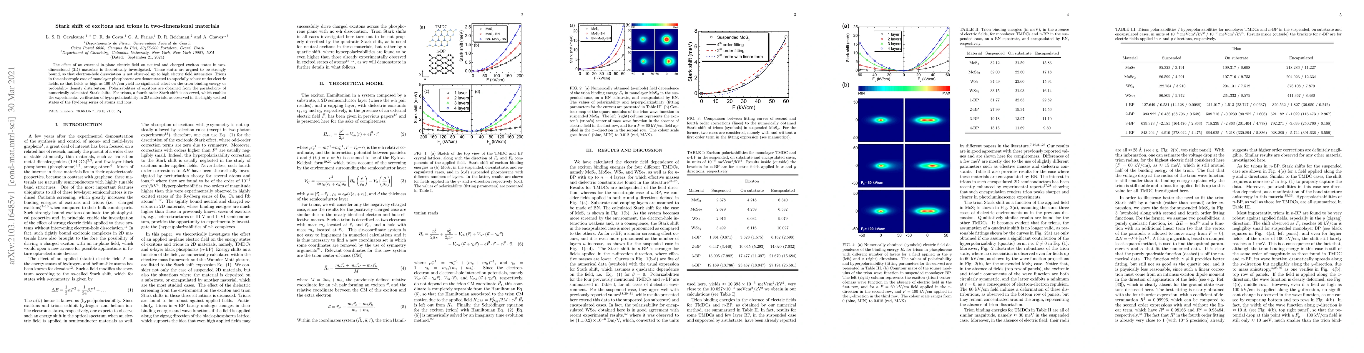This paper investigates the Stark shift in excitons and trions in 2D materials under in-plane electric fields, finding that these states remain strongly bound even at high field intensities. Notably, trions in monolayer phosphorene show remarkable robustness, with no significant changes up to 100 kV/cm, and a fourth-order Stark shift is observed for trions, enabling the experimental verification of hyperpolarizability in 2D materials.