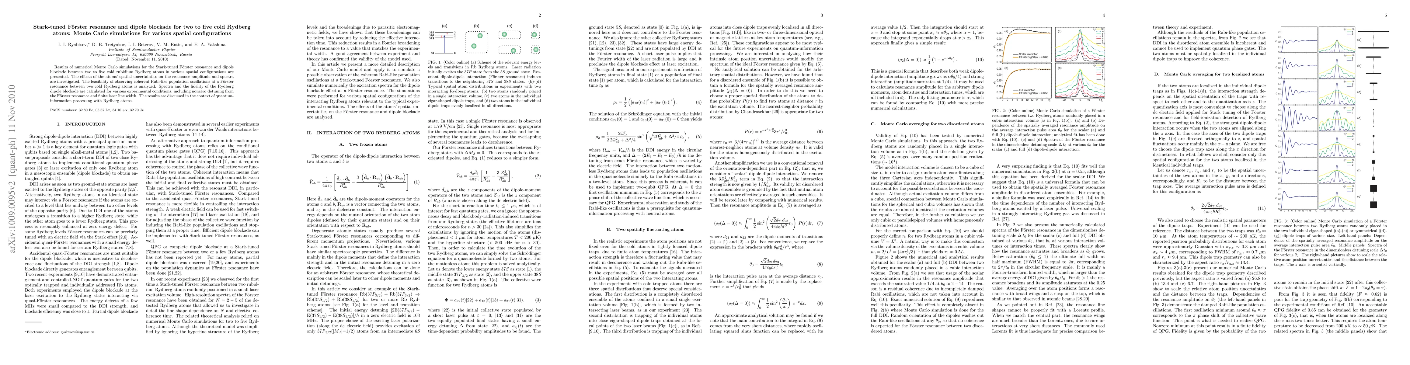 Monte Carlo simulations reveal the effects of spatial uncertainties on Stark-tuned Förster resonance and dipole blockade for two to five cold Rydberg atoms, highlighting the feasibility of coherent Rabi-like oscillations and the fidelity of Rydberg dipole blockade under various experimental conditions. The study supports quantum-information processing applications with Rydberg atoms.