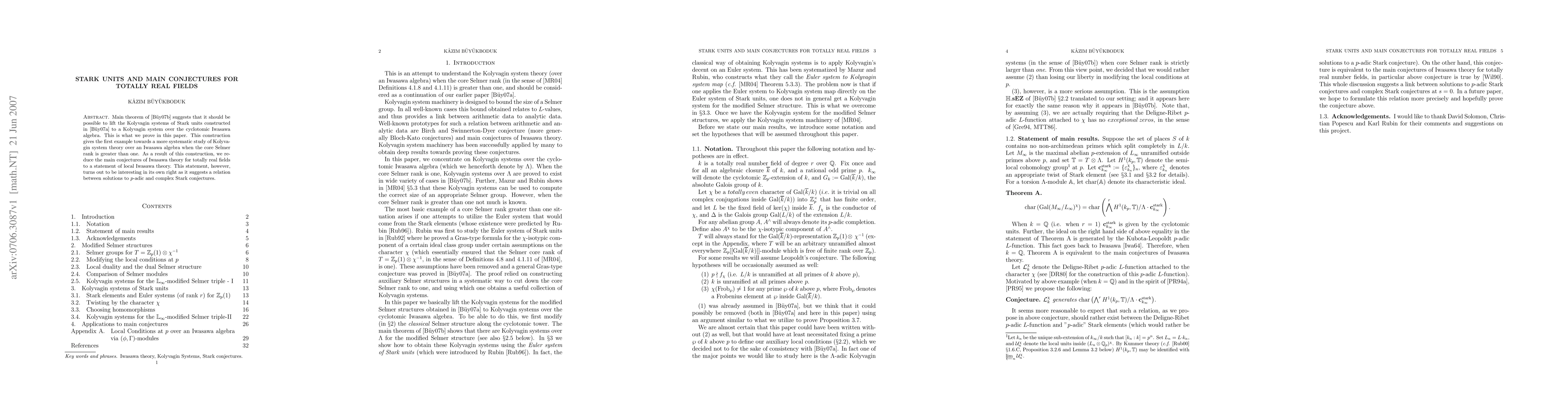 Main theorem of [Buyukboduk, arXiv:0706.0377v1] suggests that it should be possible to lift the Kolyvagin systems of Stark units constructed in [Buyukboduk, arXiv:math/0703426v1] to a Kolyvagin system over the cyclotomic Iwasawa algebra. This is what we prove in this paper. This construction gives the first example towards a more systematic study of Kolyvagin system theory over an Iwasawa algebra when the core Selmer rank is greater than one. As a result of this construction, we reduce the main conjectures of Iwasawa theory for totally real fields to a statement of local Iwasawa theory. This statement, however, turns out to be interesting in its own right as it suggests a relation between solutions to $p$-adic and complex Stark conjectures.