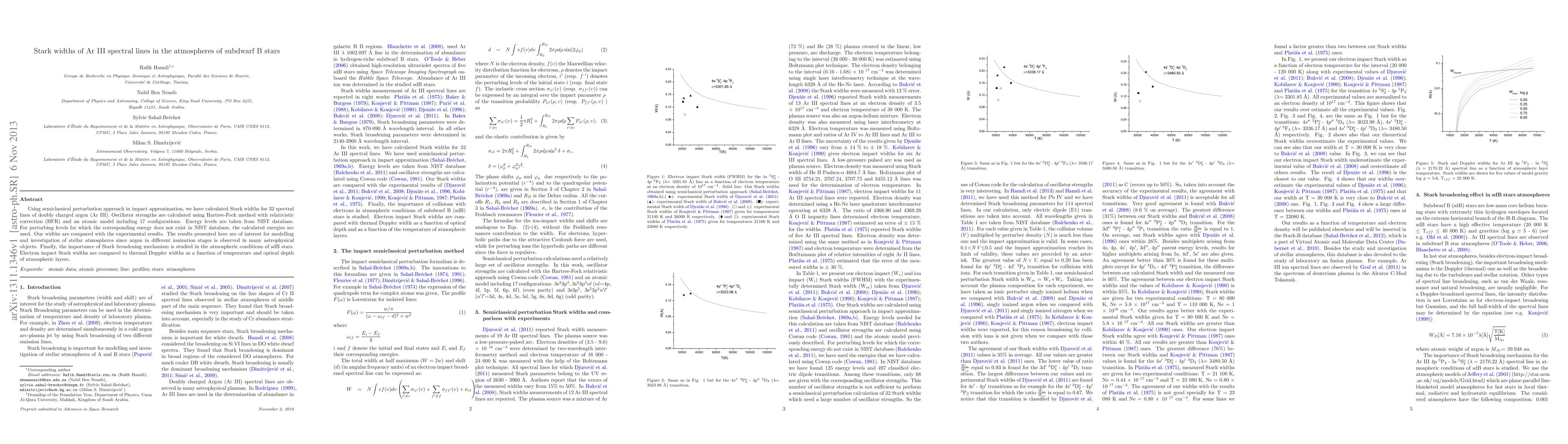 This paper calculates Stark widths for 32 spectral lines of Ar III using a semiclassical perturbation approach, with oscillator strengths derived from relativistic Hartree-Fock method. The results are compared to experimental data and are significant for modeling stellar atmospheres, particularly subdwarf B stars, where argon ionization stages are prevalent.