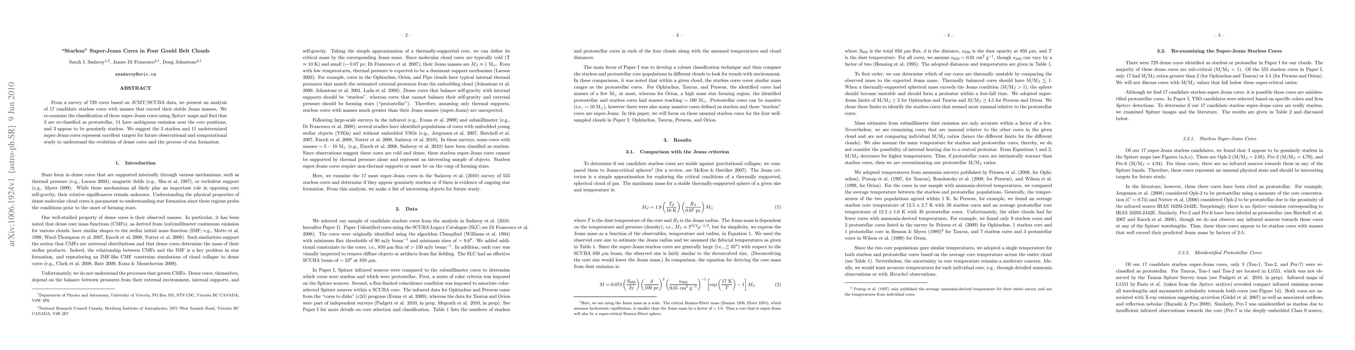 From a survey of 729 cores based on JCMT/SCUBA data, we present an analysis of 17 candidate starless cores with masses that exceed their stable Jeans masses. We re-examine the classification of these super-Jeans cores using Spitzer maps and find that 3 are re-classified as protostellar, 11 have ambiguous emission near the core positions, and 3 appear to be genuinely starless. We suggest the 3 starless and 11 undetermined super-Jeans cores represent excellent targets for future observational and computational study to understand the evolution of dense cores and the process of star formation.