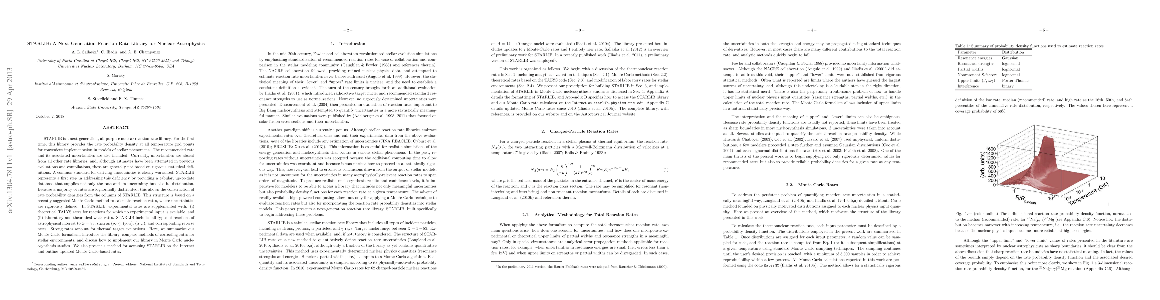 STARLIB is a next-generation, all-purpose nuclear reaction-rate library. For the first time, this library provides the rate probability density at all temperature grid points for convenient implementation in models of stellar phenomena. The recommended rate and its associated uncertainties are also included. Currently, uncertainties are absent from all other rate libraries, and, although estimates have been attempted in previous evaluations and compilations, these are generally not based on rigorous statistical definitions. A common standard for deriving uncertainties is clearly warranted. STARLIB represents a first step in addressing this deficiency by providing a tabular, up-to-date database that supplies not only the rate and its uncertainty but also its distribution. Because a majority of rates are lognormally distributed, this allows the construction of rate probability densities from the columns of STARLIB. This structure is based on a recently suggested Monte Carlo method to calculate reaction rates, where uncertainties are rigorously defined. In STARLIB, experimental rates are supplemented with: (i) theoretical TALYS rates for reactions for which no experimental input is available, and (ii) laboratory and theoretical weak rates. STARLIB includes all types of reactions of astrophysical interest to Z = 83, such as (p,g), (p,a), (a,n), and corresponding reverse rates. Strong rates account for thermal target excitations. Here, we summarize our Monte Carlo formalism, introduce the library, compare methods of correcting rates for stellar environments, and discuss how to implement our library in Monte Carlo nucleosynthesis studies. We also present a method for accessing STARLIB on the Internet and outline updated Monte Carlo-based rates.