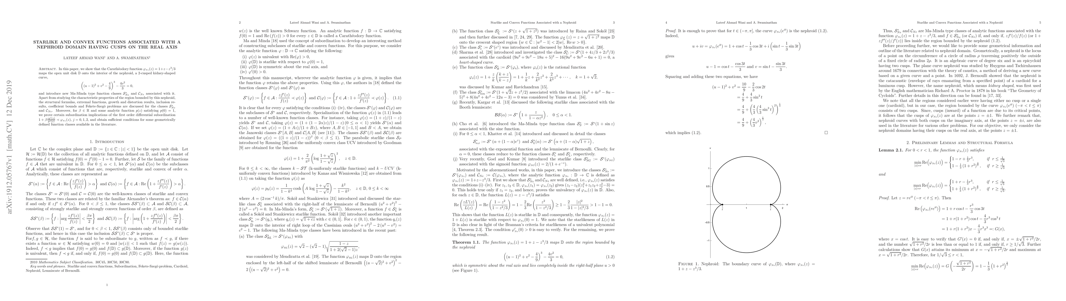 In this paper, we show that the Carath\'{e}odory function $\varphi_{\scriptscriptstyle {Ne}}(z)=1+z-z^3/3$ maps the open unit disk $\mathbb{D}$ onto the interior of the nephroid, a $2$-cusped kidney-shaped curve, \begin{align*} \left((u-1)^2+v^2-\frac{4}{9}\right)^3-\frac{4 v^2}{3}=0, \end{align*} and introduce new Ma-Minda type function classes $\mathcal{S}^*_{Ne}$ and $\mathcal{C}_{Ne}$ associated with it. Apart from studying the characteristic properties of the region bounded by this nephroid, the structural formulas, extremal functions, growth and distortion results, inclusion results, coefficient bounds and Fekete-Szeg\"{o} problems are discussed for the classes $\mathcal{S}^*_{Ne}$ and $\mathcal{C}_{Ne}$. Moreover, for $\beta\in\mathbb{R}$ and some analytic function $p(z)$ satisfying $p(0)=1$, we prove certain subordination implications of the first order differential subordination $1+\beta\frac{zp'(z)}{p^j(z)}\prec\varphi_{\scriptscriptstyle {Ne}}(z),\,j=0,1,2,$ and obtain sufficient conditions for some geometrically defined function classes available in the literature.