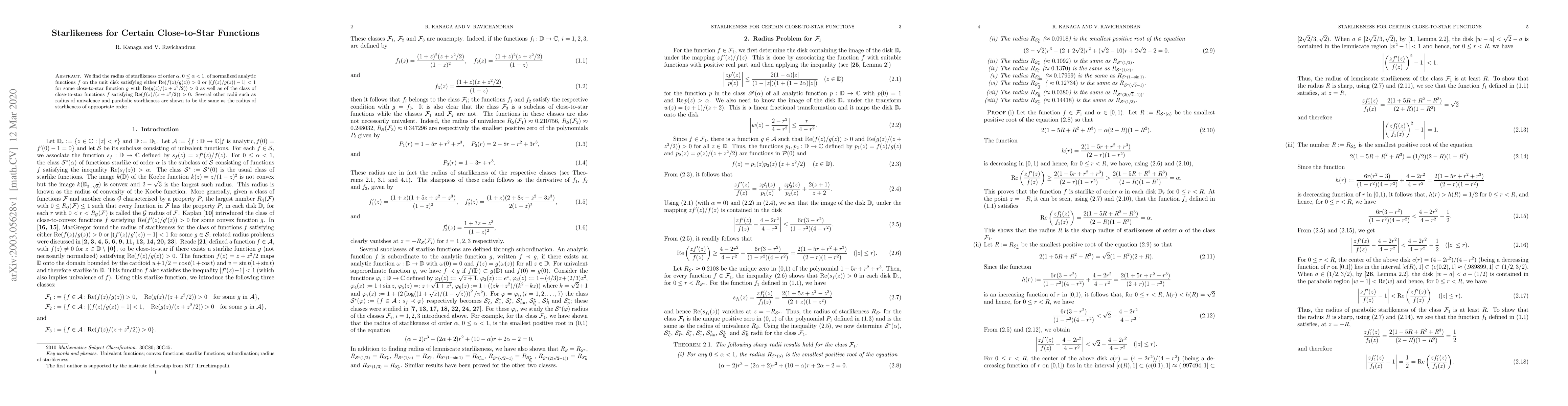 We find the radius of starlikeness of order $\alpha$, $0\leq \alpha<1$, of normalized analytic functions $f$ on the unit disk satisfying either $\operatorname{Re}(f(z)/g(z))>0$ or $\left| (f(z)/g(z))-1\right|<1$ for some close-to-star function $g$ with $\operatorname{Re}(g(z)/(z+z^2/2))>0$ as well as of the class of close-to-star functions $f$ satisfying $\operatorname{Re}(f(z)/(z+z^2/2))>0$. Several other radii such as radius of univalence and parabolic starlikeness are shown to be the same as the radius of starlikeness of appropriate order.