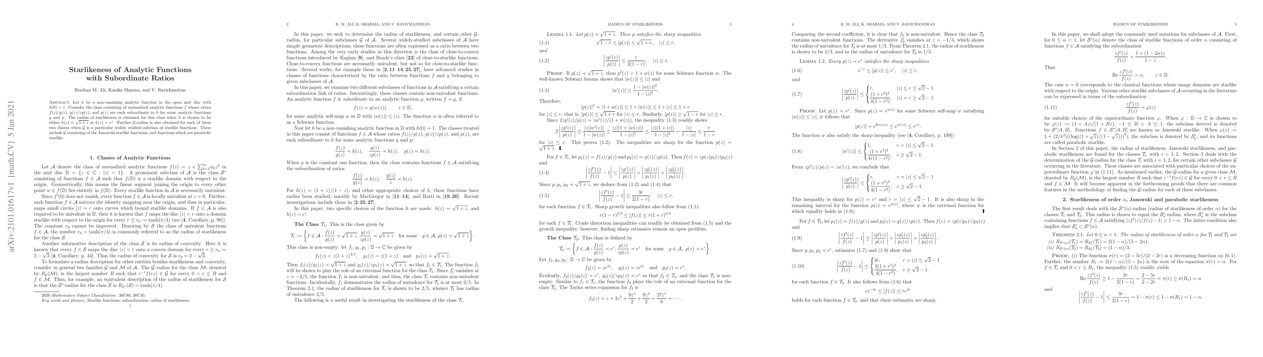 This paper investigates the starlikeness of normalized analytic functions whose ratios are subordinate to $h(z)=\sqrt{1+z}$ or $h(z)=e^z$. It determines the radius of starlikeness and the $\mathcal{G}$-radius for specific subclasses of starlike functions, including Janowski and parabolic starlike functions.