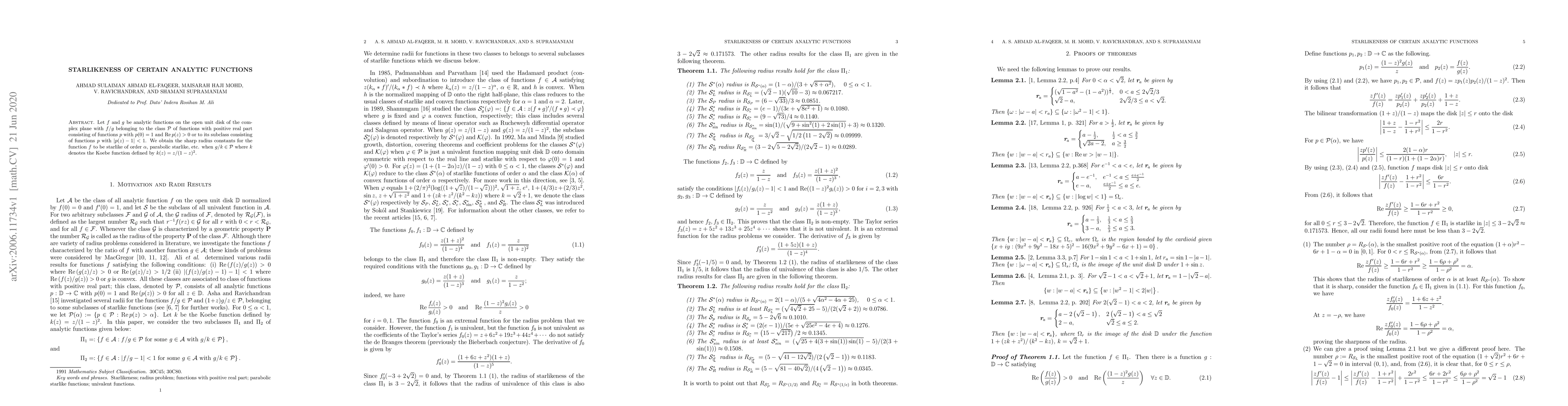 The paper presents detailed derivations and calculations for sharp radius constants of starlikeness for various subclasses of analytic functions, providing a comprehensive analysis of their properties under given conditions.