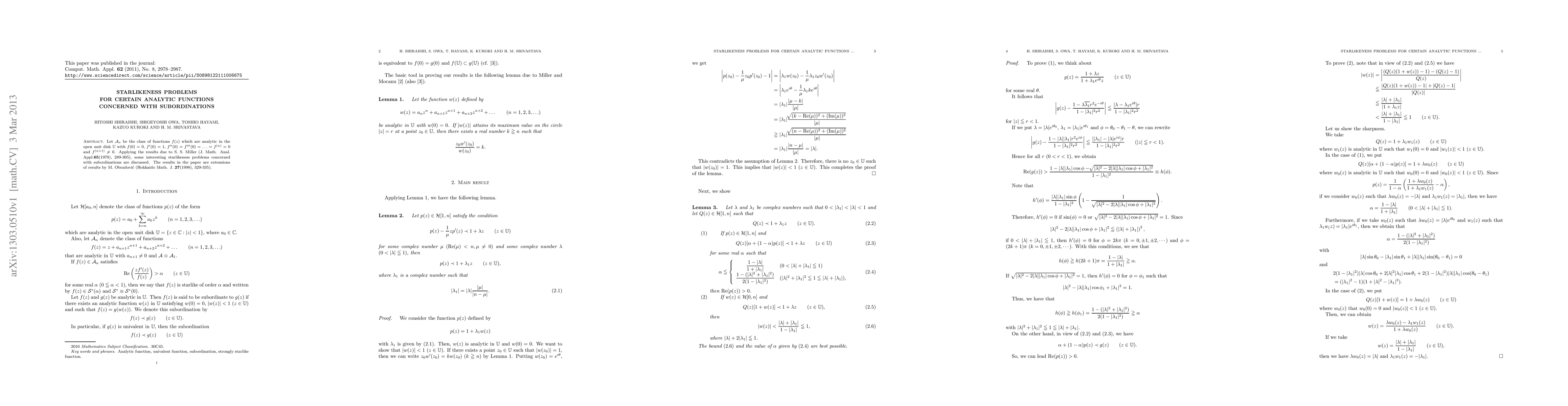 This paper explores starlikeness properties for a class of analytic functions, denoted A_n, defined by specific conditions in the open unit disk. It extends previous results by Miller and Obradović using subordination techniques, contributing to the understanding of starlike functions in complex analysis.