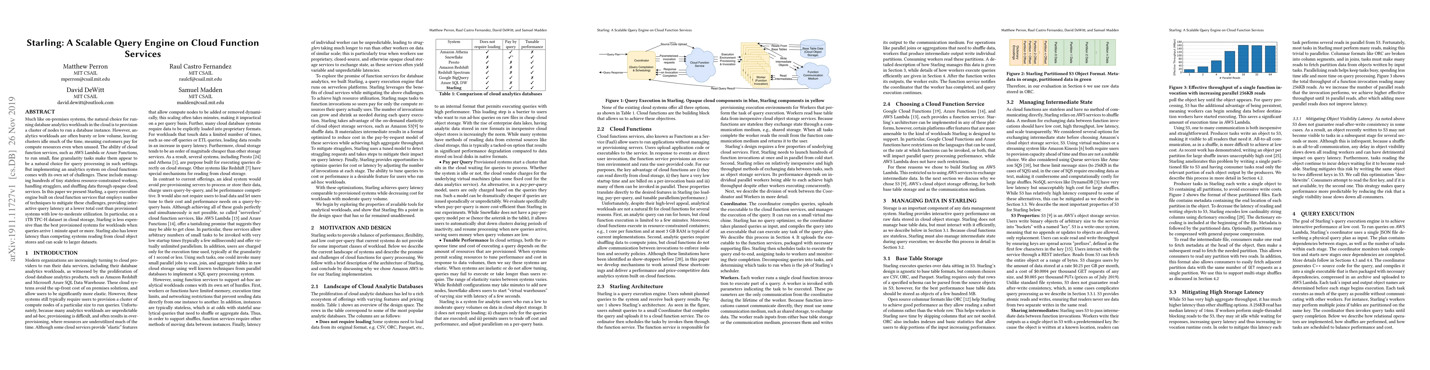 Starling is a query execution engine built on cloud function services to efficiently handle bursty or low-volume analytics workloads, achieving interactive query latency and lower total costs compared to traditional provisioned systems. It effectively scales to larger datasets and is more cost-effective for workloads with query intervals of one minute or more.