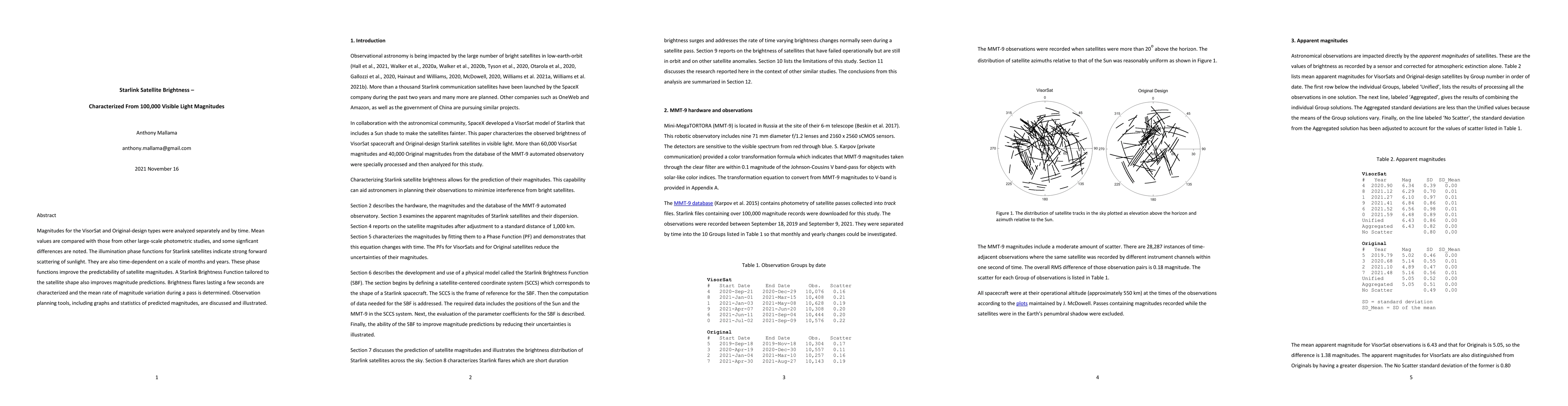 Researchers analyzed Starlink satellite brightness from 100,000 light magnitudes, finding significant differences in magnitude predictions compared to other studies, with improvements made through the development of a tailored brightness function and observation planning tools.