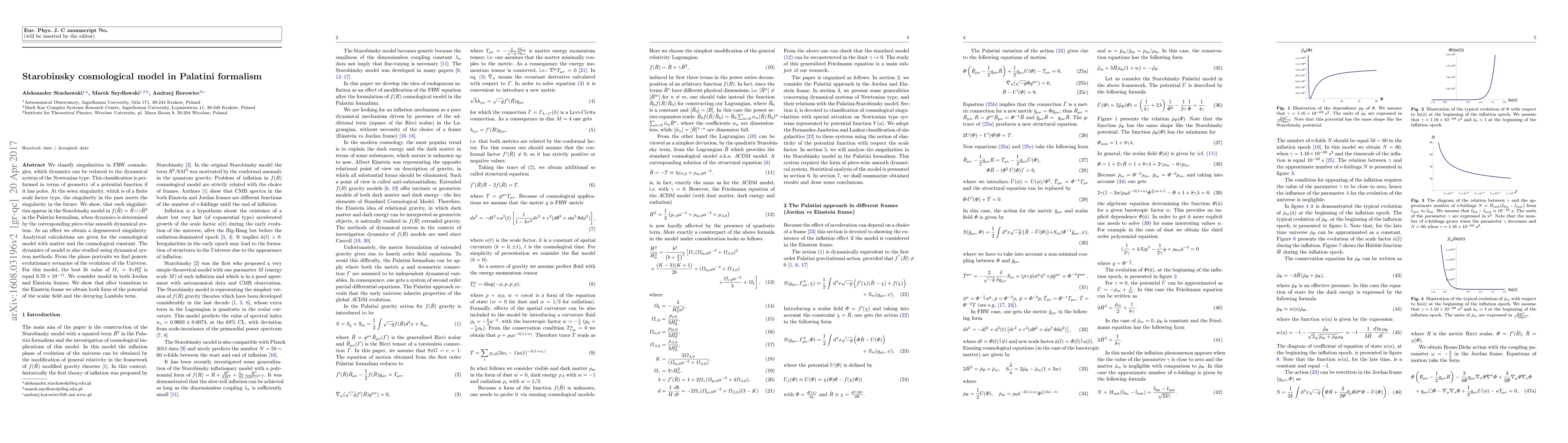 This paper classifies singularities in FRW cosmologies, finding that the Starobinsky model in Palatini formalism exhibits a degenerate singularity. Using dynamical system methods, it analyzes the model with matter and cosmological constant, determining generic evolutionary scenarios. The best fit value of Ω_γ is found to be 9.70×10^-11. The model is examined in both Jordan and Einstein frames, revealing a scalar field potential and decaying Lambda term upon transition to the Einstein frame.