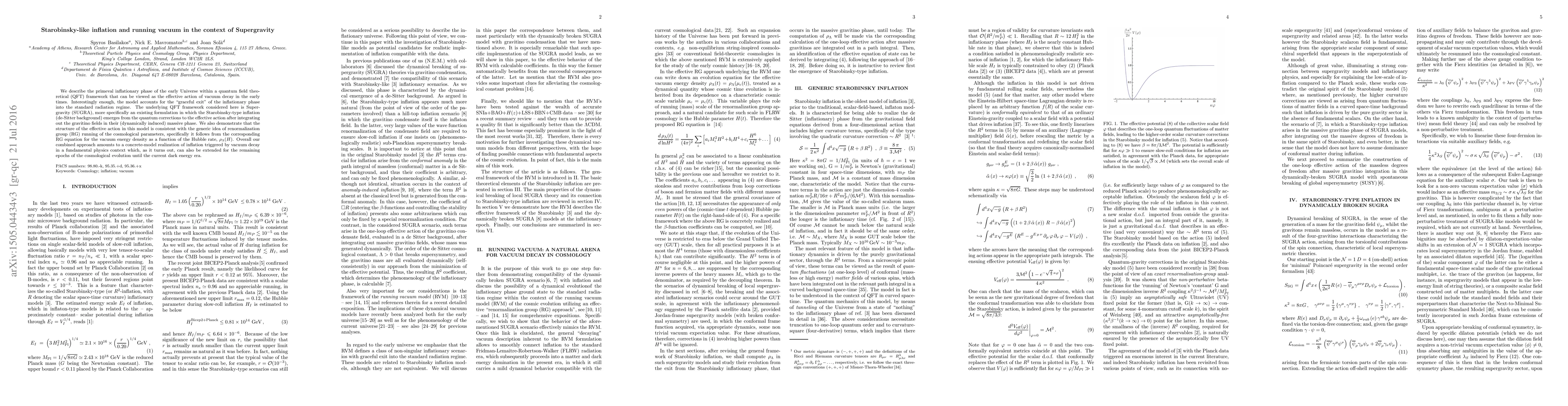 We describe the primeval inflationary phase of the early Universe within a quantum field theoretical (QFT) framework that can be viewed as the effective action of vacuum decay in the early times. Interestingly enough, the model accounts for the "graceful exit" of the inflationary phase into the standard radiation regime. The underlying QFT framework considered here is Supergravity (SUGRA), more specifically an existing formulation in which the Starobinsky-type inflation (de-Sitter background) emerges from the quantum corrections to the effective action after integrating out the gravitino fields in their (dynamically induced) massive phase. We also demonstrate that the structure of the effective action in this model is consistent with the generic idea of renormalization group (RG) running of the cosmological parameters, specifically it follows from the corresponding RG equation for the vacuum energy density as a function of the Hubble rate, $\rho_{\Lambda}(H)$. Overall our combined approach amounts to a concrete-model realization of inflation triggered by vacuum decay in a fundamental physics context which, as it turns out, can also be extended for the remaining epochs of the cosmological evolution until the current dark energy era.