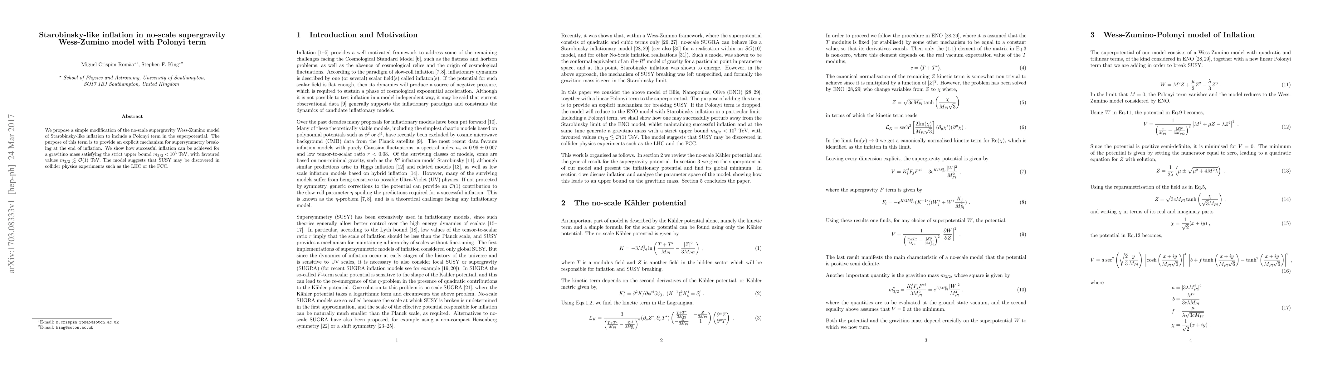 We propose a simple modification of the no-scale supergravity Wess-Zumino model of Starobinsky-like inflation to include a Polonyi term in the superpotential. The purpose of this term is to provide an explicit mechanism for supersymmetry breaking at the end of inflation. We show how successful inflation can be achieved for a gravitino mass satisfying the strict upper bound $m_{3/2}< 10^3$ TeV, with favoured values $m_{3/2}\lesssim\mathcal{O}(1)$ TeV. The model suggests that SUSY may be discovered in collider physics experiments such as the LHC or the FCC.