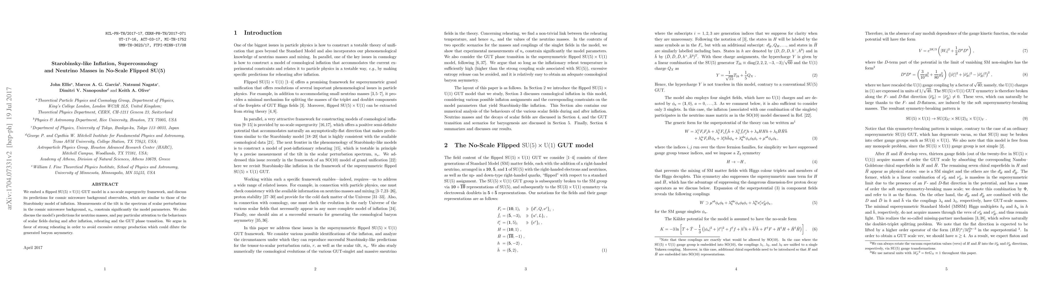 This paper explores a flipped SU(5) GUT model within a no-scale supergravity framework, predicting cosmic microwave background observables akin to the Starobinsky inflation model. It also examines the model's implications for neutrino masses and the dynamics of scalar fields during and after inflation, advocating for strong reheating to prevent excessive entropy production.