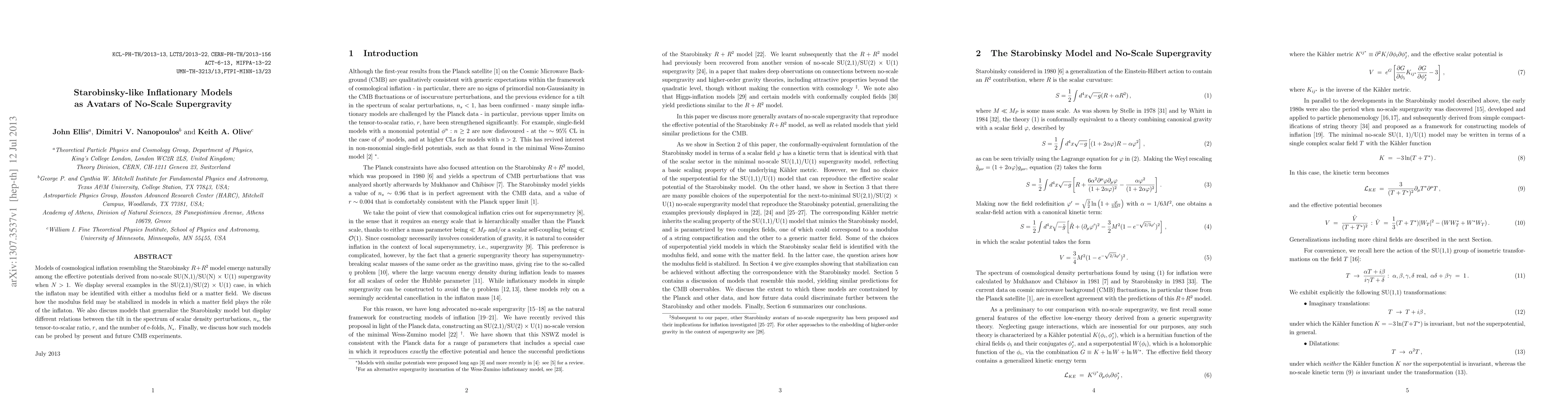 Models of cosmological inflation resembling the Starobinsky R + R^2 model emerge naturally among the effective potentials derived from no-scale SU(N,1)/SU(N) x U(1) supergravity when N > 1. We display several examples in the SU(2,1)/SU(2) x U(1) case, in which the inflaton may be identified with either a modulus field or a matter field. We discuss how the modulus field may be stabilized in models in which a matter field plays the role of the inflaton. We also discuss models that generalize the Starobinsky model but display different relations between the tilt in the spectrum of scalar density perturbations, n_s, the tensor-to-scalar ratio, r, and the number of e-folds, N_*. Finally, we discuss how such models can be probed by present and future CMB experiments.