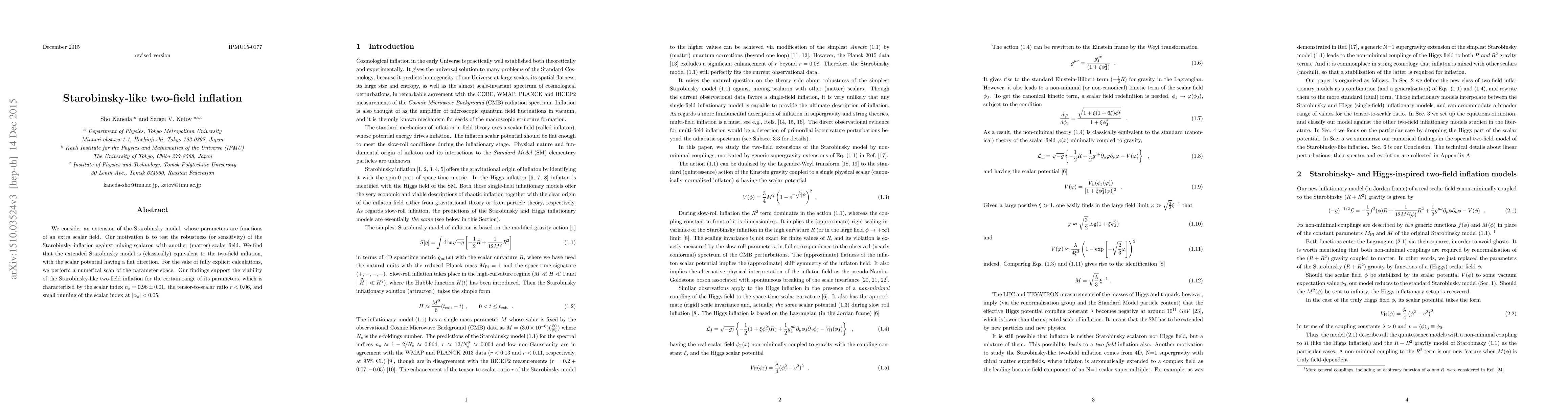 The paper introduces and analyzes a two-field inflation model that extends the Starobinsky model, demonstrating its classical equivalence and numerical viability under specific parameter constraints.