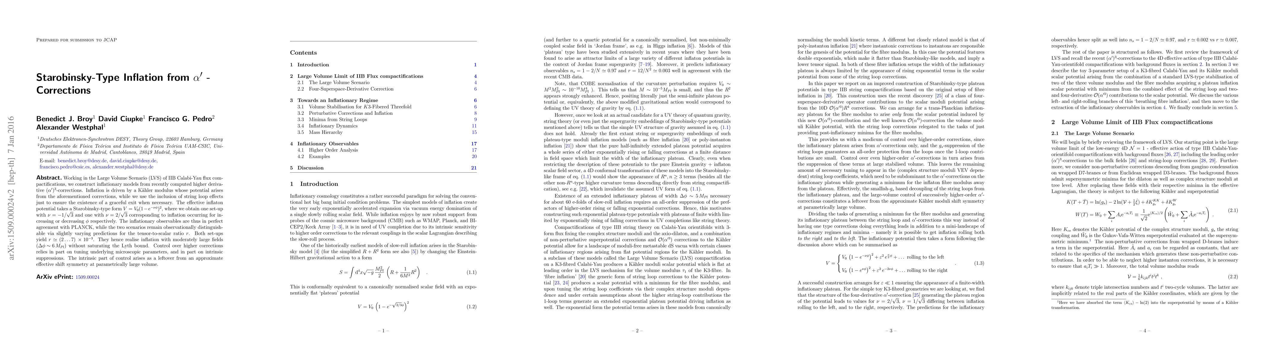 This paper constructs inflationary models in the Large Volume Scenario of IIB string theory using $(\alpha')^3$-corrections, yielding a Starobinsky-type potential. The models predict inflationary observables consistent with Planck data and allow for observational distinction via slight variations in the tensor-to-scalar ratio.