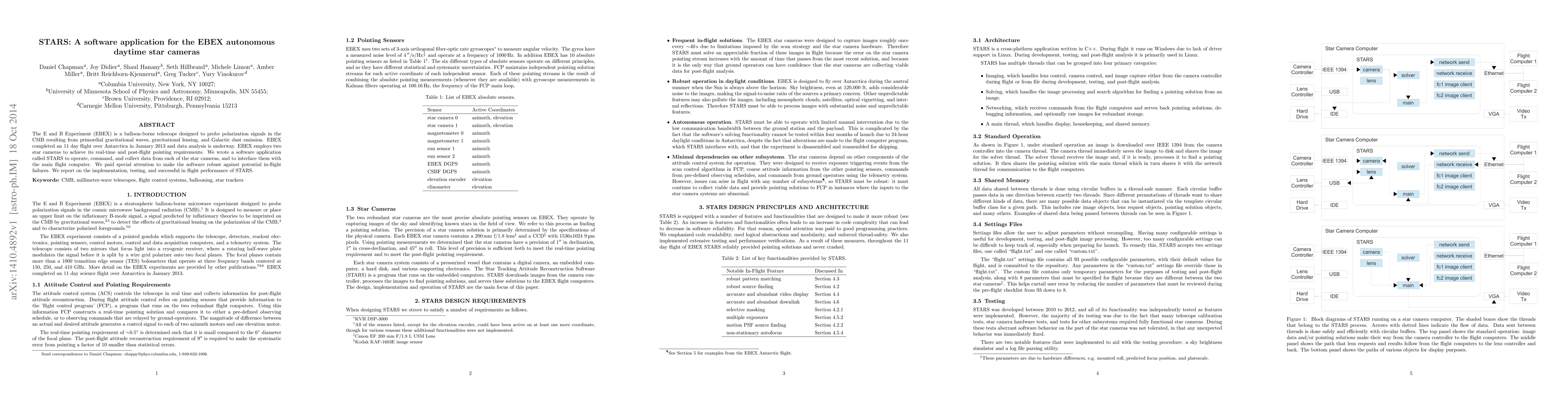 Title: STARS: A software application for the EBEX autonomous daytime star cameras Summary: The paper describes STARS, a software application developed to operate and command EBEX's star cameras, ensuring robust data collection and interfacing with the main flight computer, which was successfully tested and performed well during EBEX's 2013 Antarctic balloon flight.