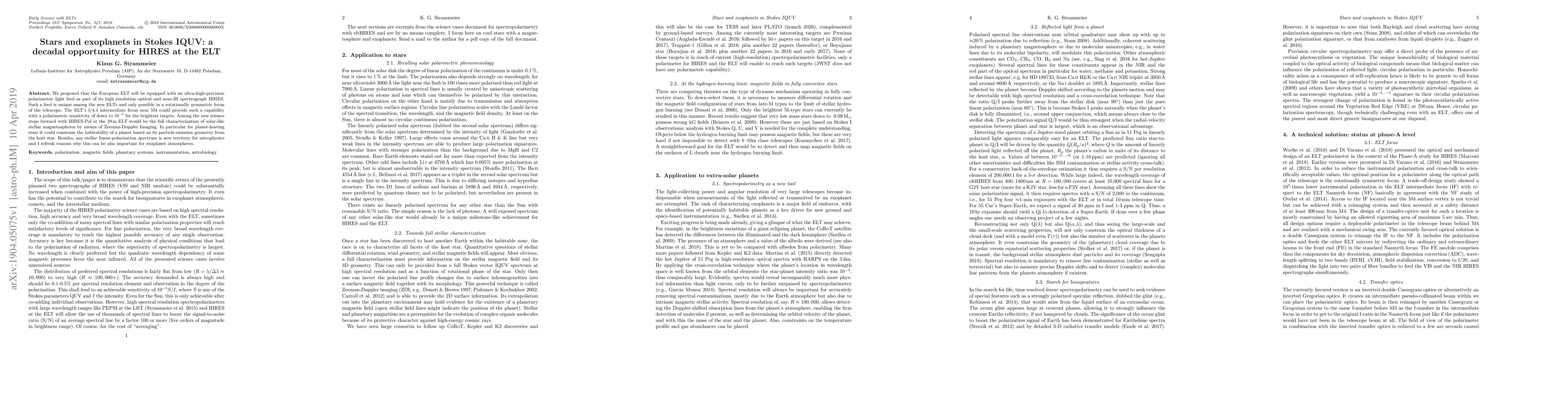 We proposed that the European ELT will be equipped with an ultra-high-precision polarimetric light feed as part of its high resolution optical and near-IR spectrograph HIRES. Such a feed is unique among the new ELTs and only possible in a rotationally symmetric focus of the telescope. The ELT's f/4.4 intermediate focus near M4 could provide such a capability with a polarimetric sensitivity of down to 10^(-5) for the brightest targets. Among the new science steps forward with HIRES-Pol at the 39m ELT would be the full characterization of solar-like stellar magnetospheres by means of Zeeman-Doppler Imaging. In particular for planet-hosting stars it could constrain the habitability of a planet based on its particle-emission geometry from the host star. Besides, any stellar linear-polarization spectrum is new territory for astrophysics and I refresh reasons why this can be also important for exoplanet atmospheres.