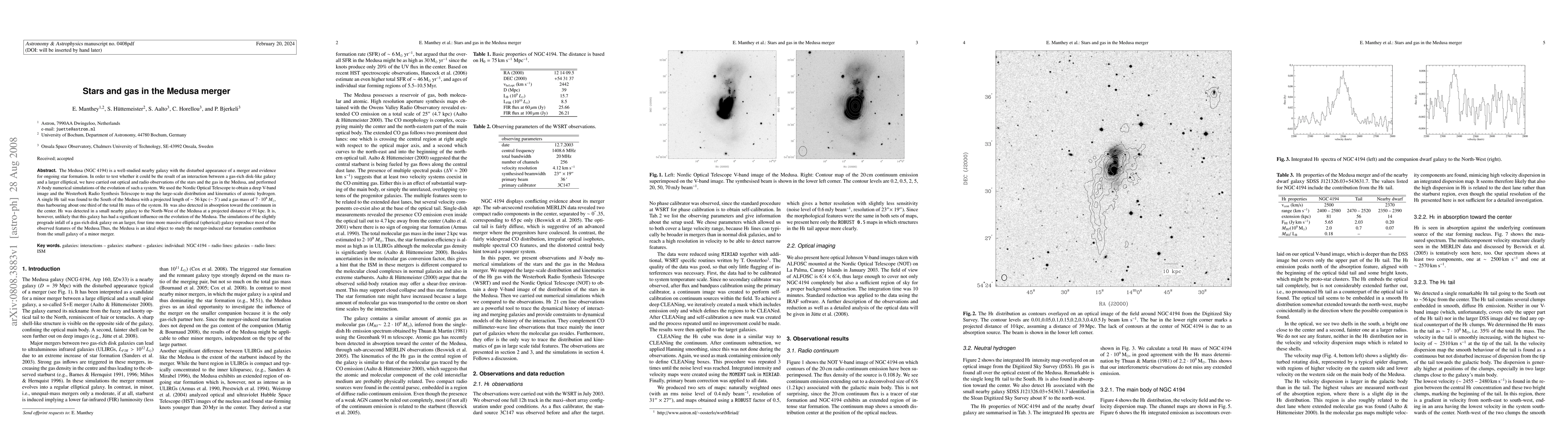 The Medusa (NGC 4194) is a well-studied nearby galaxy with the disturbed appearance of a merger and evidence for ongoing star formation. In order to test whether it could be the result of an interaction between a gas-rich disk-like galaxy and a larger elliptical, we have carried out optical and radio observations of the stars and the gas in the Medusa, and performed $N$-body numerical simulations of the evolution of such a system. We used the Nordic Optical Telescope to obtain a deep V-band image and the Westerbork Radio Synthesis Telescope to map the large-scale distribution and kinematics of atomic hydrogen. A single HI tail was found to the South of the Medusa with a projected length of 56 kpc (5') and a gas mass of 7* 10^8 M_sun, thus harbouring about one third of the total HI mass of the system. HI was also detected in absorption toward the continuum in the center. HI was detected in a small nearby galaxy to the North-West of the Medusa at a projected distance of 91 kpc. It is, however, unlikely that this galaxy has had a significant influence on the evolution of the Medusa. The simulations of the slightly prograde infall of a gas-rich disk galaxy on an larger, four time more massive elliptical (spherical) galaxy reproduce most of the observed features of the Medusa.Thus, the Medusa is an ideal object to study the merger-induced star formation contribution from the small galaxy of a minor merger.