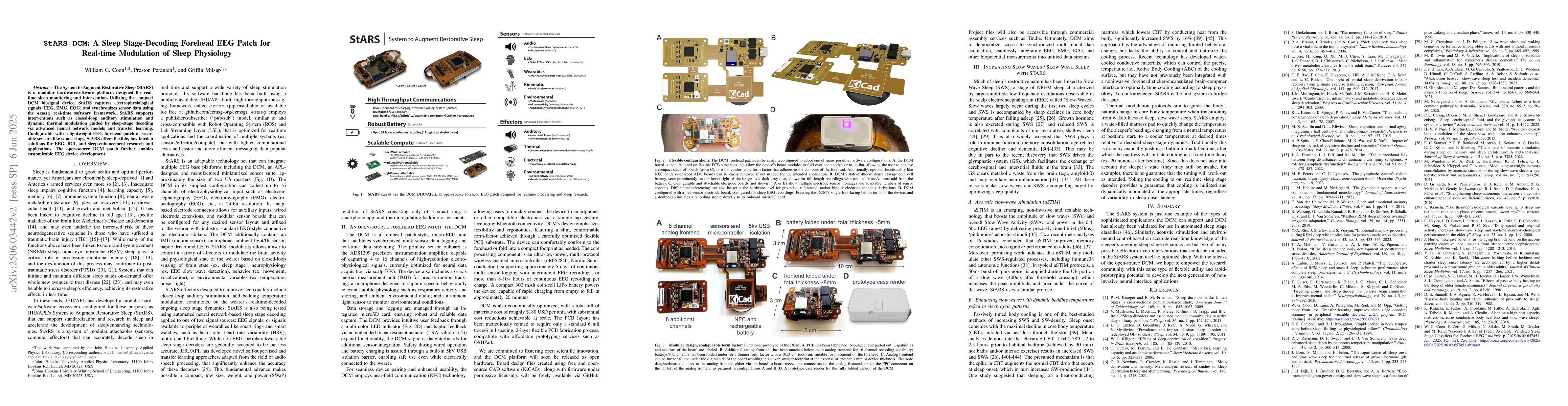 The System to Augment Restorative Sleep (StARS) is a modular hardware/software platform designed for real-time sleep monitoring and intervention. Utilizing the compact DCM biosignal device, StARS captures electrophysiological signals (EEG, EMG, EOG) and synchronizes sensor data using the ezmsg real-time software framework. StARS supports interventions such as closed-loop auditory stimulation and dynamic thermal modulation guided by sleep-stage decoding via advanced neural network models and transfer learning. Configurable with a lightweight EEG forehead patch or wearable sensors like smart rings, StARS offers flexible, low-burden solutions for EEG, BCI, and sleep-enhancement research and applications. The open-source DCM patch further enables customizable EEG device development.