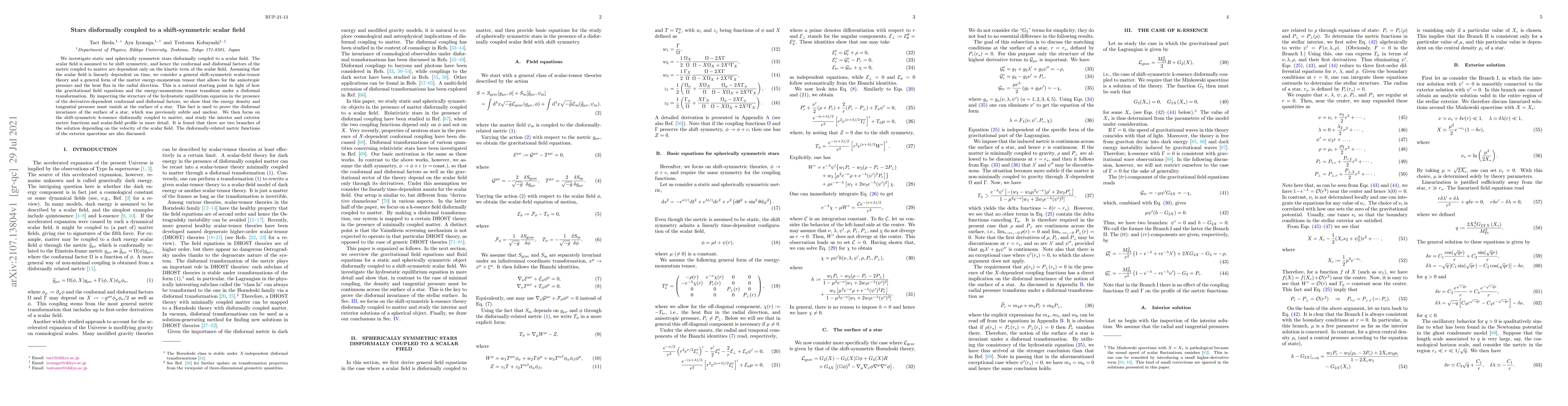 We investigate static and spherically symmetric stars disformally coupled to a scalar field. The scalar field is assumed to be shift symmetric, and hence the conformal and disformal factors of the metric coupled to matter are dependent only on the kinetic term of the scalar field. Assuming that the scalar field is linearly dependent on time, we consider a general shift-symmetric scalar-tensor theory and a general form of the matter energy-momentum tensor that allows for the anisotropic pressure and the heat flux in the radial direction. This is a natural starting point in light of how the gravitational field equations and the energy-momentum tensor transform under a disformal transformation. By inspecting the structure of the hydrostatic equilibrium equation in the presence of the derivative-dependent conformal and disformal factors, we show that the energy density and tangential pressure must vanish at the surface of a star. This fact is used to prove the disformal invariance of the surface of a star, which was previously subtle and unclear. We then focus on the shift-symmetric k-essence disformally coupled to matter, and study the interior and exterior metric functions and scalar-field profile in more detail. It is found that there are two branches of the solution depending on the velocity of the scalar field. The disformally-related metric functions of the exterior spacetime are also discussed.