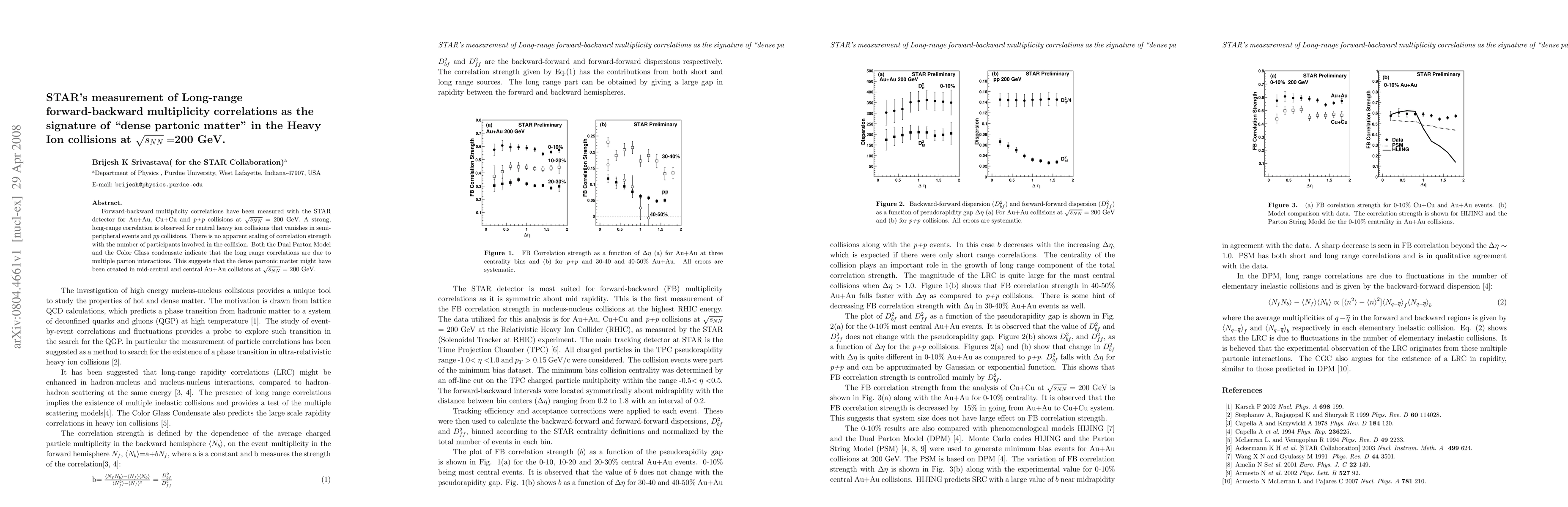 The STAR experiment observed strong long-range forward-backward multiplicity correlations in central heavy ion collisions at 200 GeV, indicating the presence of dense partonic matter, while these correlations are absent in semi-peripheral events and proton-proton collisions. The findings suggest multiple parton interactions as the underlying mechanism.