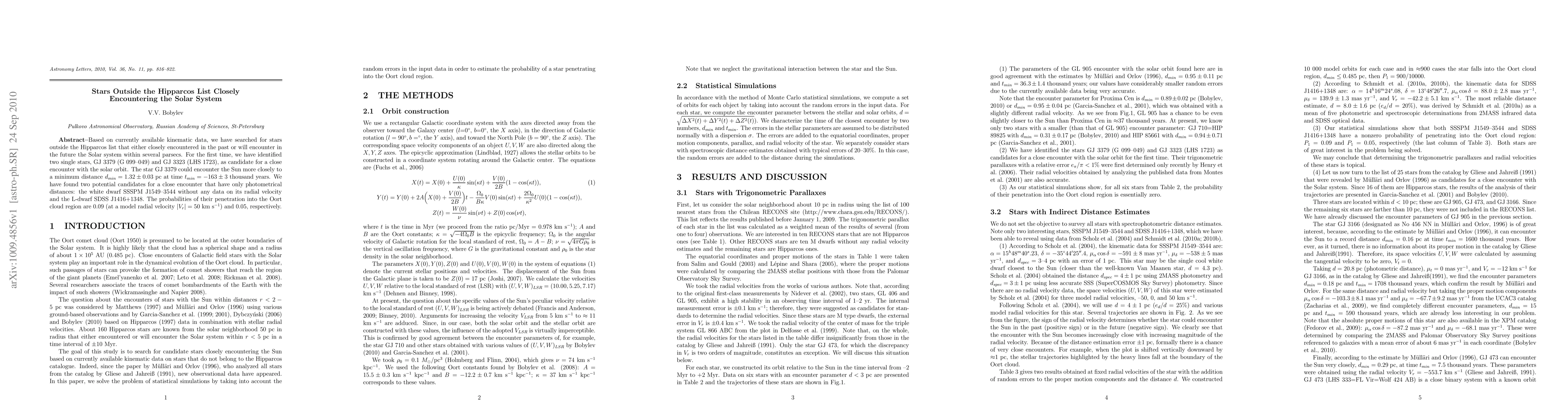 This research identifies two stars, GJ 3379 and GJ 3323, outside the Hipparcos list that have had or will have close encounters with the Solar System. GJ 3379 is predicted to have come as close as 1.32 pc to the Sun about 163 thousand years ago. Two other potential candidates, a white dwarf and an L-dwarf, are also discussed for their possible future encounters.
