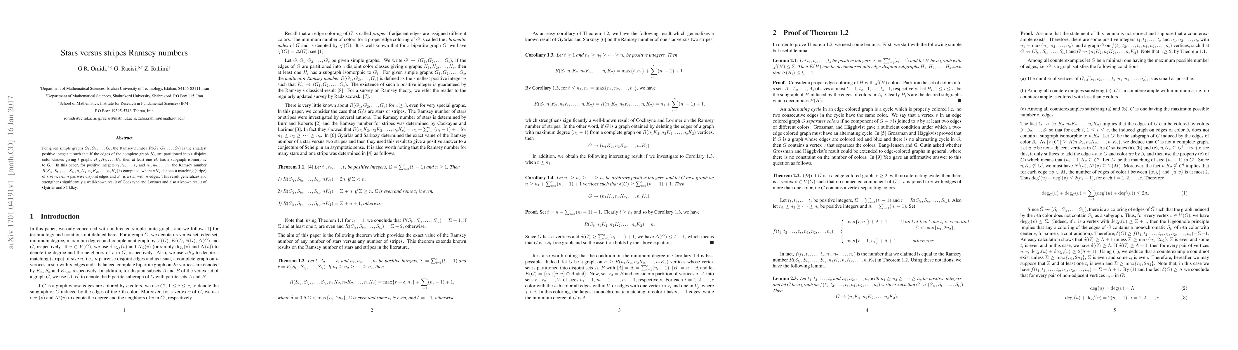 For given simple graphs $G_1, G_2, \ldots , G_t$, the Ramsey number $R(G_1, G_2, \ldots, G_t)$ is the smallest positive integer $n$ such that if the edges of the complete graph $K_n$ are partitioned into $t$ disjoint color classes giving $t$ graphs $H_1,H_2,\ldots,H_t$, then at least one $H_i$ has a subgraph isomorphic to $G_i$. In this paper, for positive integers $t_1,t_2,\ldots, t_s$ and $n_1,n_2,\ldots, n_c$ the Ramsey number $R(S_{t_1}, S_{t_2},\ldots ,S_{t_s}, n_1K_2,n_2K_2,\ldots,n_cK_2)$ is computed, where $nK_2$ denotes a matching (stripe) of size $n$, i.e., $n$ pairwise disjoint edges and $S_{n}$ is a star with $n$ edges. This result generalizes and strengthens significantly a well-known result of Cockayne and Lorimer and also a known result of Gy\'{a}rf\'{a}s and S\'{a}rk\"{o}zy.