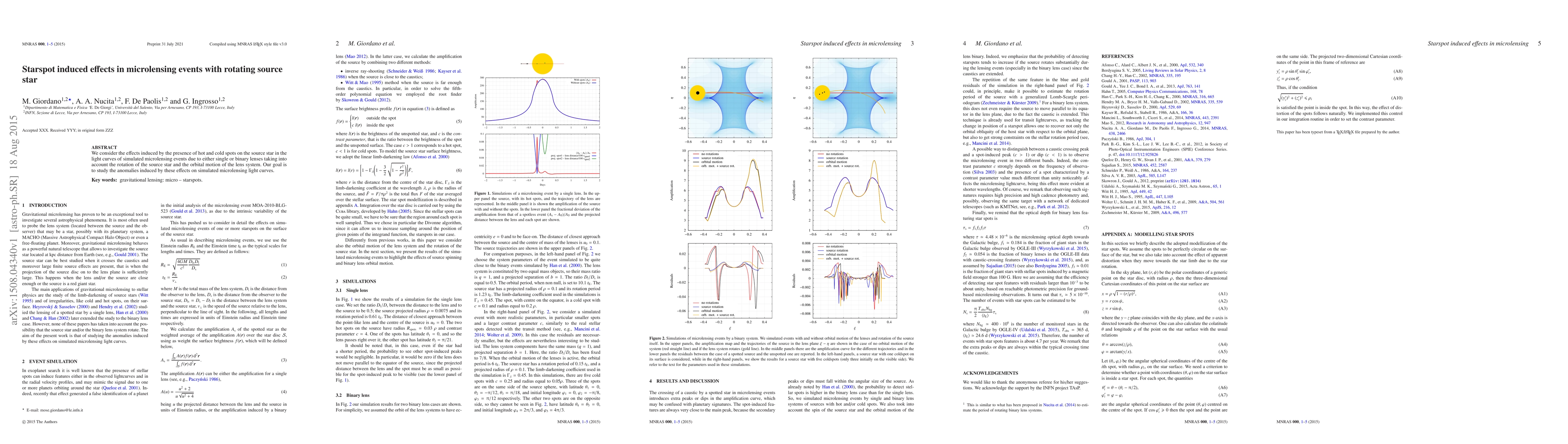 We consider the effects induced by the presence of hot and cold spots on the source star in the light curves of simulated microlensing events due to either single or binary lenses taking into account the rotation of the source star and the orbital motion of the lens system. Our goal is to study the anomalies induced by these effects on simulated microlensing light curves.