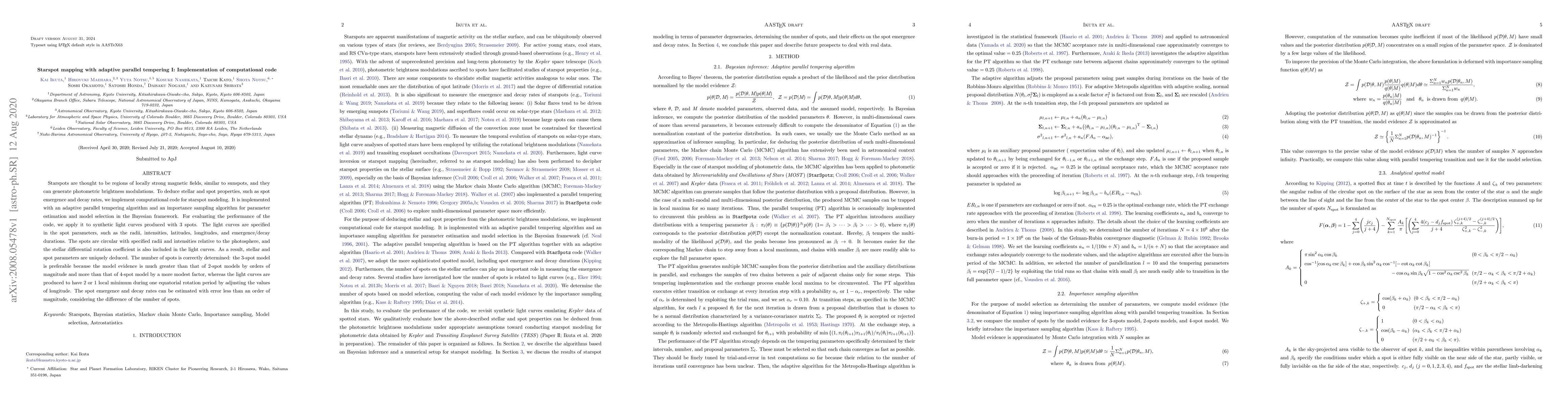 Starspots are thought to be regions of locally strong magnetic fields, similar to sunspots, and they can generate photometric brightness modulations. To deduce stellar and spot properties, such as spot emergence and decay rates, we implement computational code for starspot modeling. It is implemented with an adaptive parallel tempering algorithm and an importance sampling algorithm for parameter estimation and model selection in the Bayesian framework. For evaluating the performance of the code, we apply it to synthetic light curves produced with 3 spots. The light curves are specified in the spot parameters, such as the radii, intensities, latitudes, longitudes, and emergence/decay durations. The spots are circular with specified radii and intensities relative to the photosphere, and the stellar differential rotation coefficient is also included in the light curves. As a result, stellar and spot parameters are uniquely deduced. The number of spots is correctly determined: the 3-spot model is preferable because the model evidence is much greater than that of 2-spot models by orders of magnitude and more than that of 4-spot model by a more modest factor, whereas the light curves are produced to have 2 or 1 local minimum during one equatorial rotation period by adjusting the values of longitude. The spot emergence and decay rates can be estimated with error less than an order of magnitude, considering the difference of the number of spots.