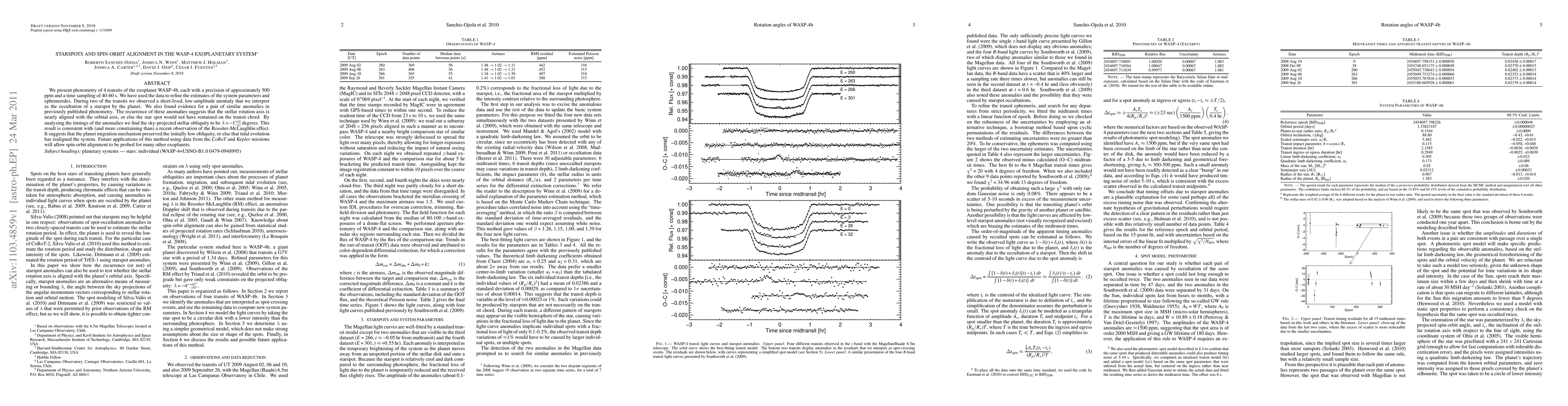We present photometry of 4 transits of the exoplanet WASP-4b, each with a precision of approximately 500 ppm and a time sampling of 40-60s. We have used the data to refine the estimates of the system parameters and ephemerides. During two of the transits we observed a short-lived, low-amplitude anomaly that we interpret as the occultation of a starspot by the planet. We also find evidence for a pair of similar anomalies in previously published photometry. The recurrence of these anomalies suggests that the stellar rotation axis is nearly aligned with the orbital axis, or else the star spot would not have remained on the transit chord. By analyzing the timings of the anomalies we find the sky-projected stellar obliquity to be -1_{-12}^{+14} degrees. This result is consistent with (and more constraining than) a recent observation of the Rossiter-McLaughlin effect. It suggests that the planet migration mechanism preserved the initially low obliquity, or else that tidal evolution has realigned the system. Future applications of this method using data from the Corot and Kepler missions will allow spin-orbit alignment to be probed for many other exoplanets.