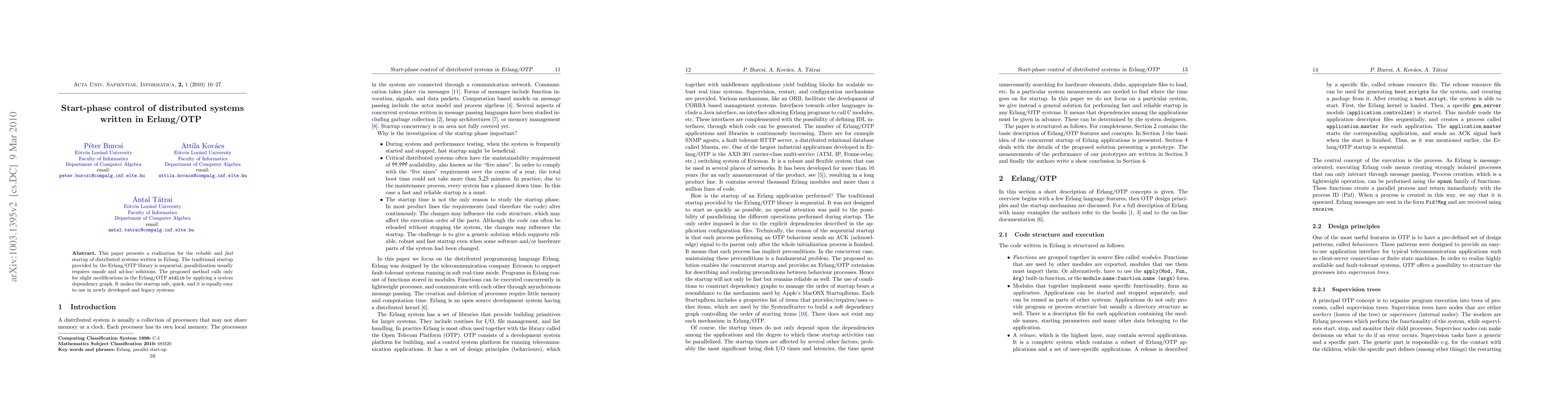 This paper introduces a method for rapid and reliable startup of Erlang/OTP distributed systems, utilizing a system dependency graph for parallelization without compromising safety. It benefits both new and existing systems by only requiring minor modifications to the Erlang/OTP stdlib.