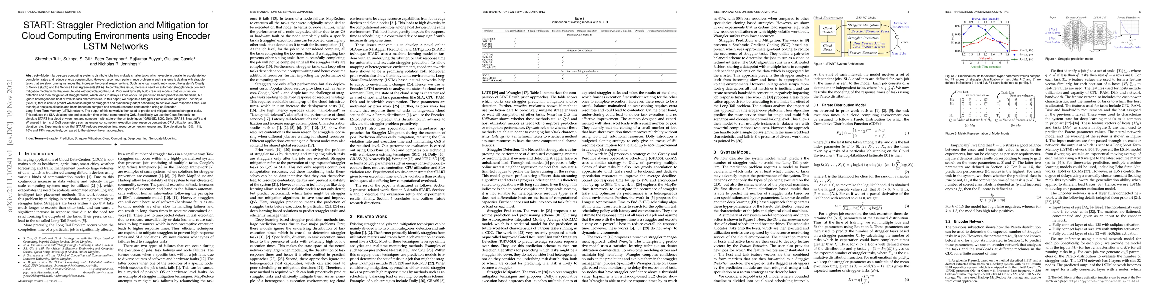 This paper proposes START, a technique using Encoder LSTM networks to predict and mitigate straggler tasks in cloud computing, aiming to reduce execution time and SLA violations. Experiments show START outperforms state-of-the-art methods in terms of execution time, resource contention, energy consumption, and SLA compliance.