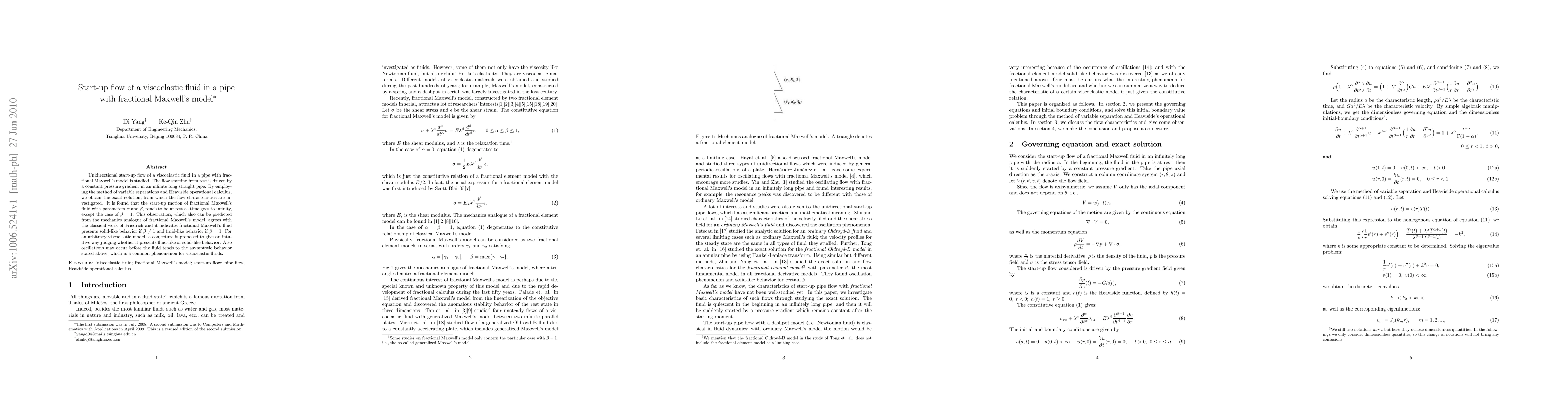 This paper investigates the start-up flow of a viscoelastic fluid modeled by a fractional Maxwell model in a pipe, deriving an exact solution using variable separations and Heaviside operational calculus. It finds that the fluid exhibits solid-like behavior for $\beta \neq 1$ and fluid-like behavior for $\beta = 1$, proposing a conjecture to determine fluid-like or solid-like behavior in general viscoelastic models.