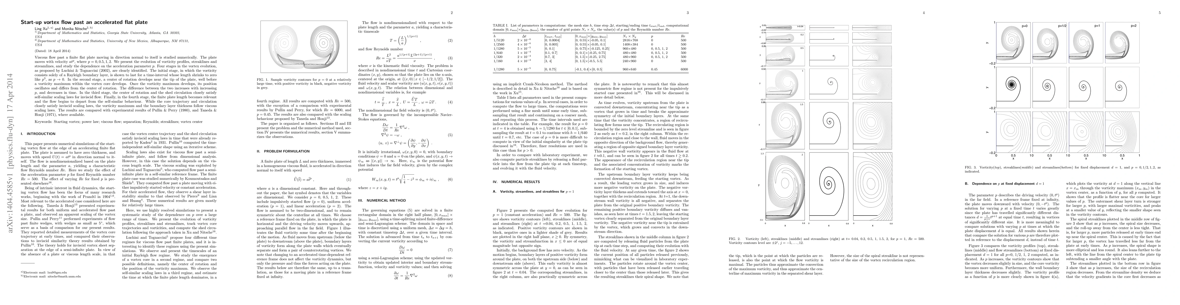 This paper numerically investigates the viscous flow around an accelerated flat plate moving perpendicular to itself, with velocity varying as $at^p$ for different acceleration parameters $p$. It identifies four stages in vortex evolution, showing how the vorticity and vortex core dynamics change with $p$, and compares findings with historical experimental results.