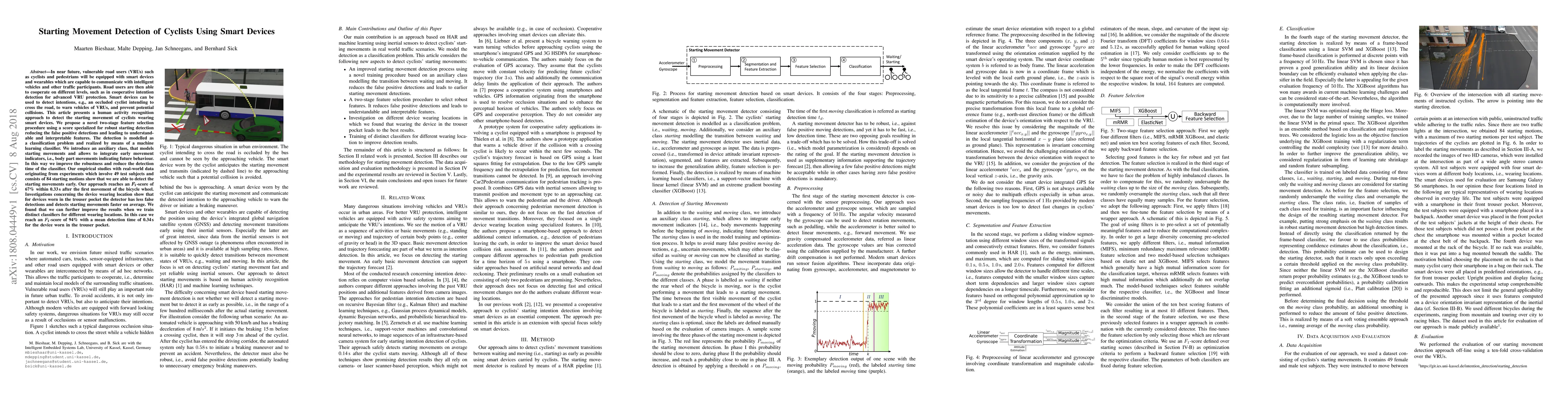 In near future, vulnerable road users (VRUs) such as cyclists and pedestrians will be equipped with smart devices and wearables which are capable to communicate with intelligent vehicles and other traffic participants. Road users are then able to cooperate on different levels, such as in cooperative intention detection for advanced VRU protection. Smart devices can be used to detect intentions, e.g., an occluded cyclist intending to cross the road, to warn vehicles of VRUs, and prevent potential collisions. This article presents a human activity recognition approach to detect the starting movement of cyclists wearing smart devices. We propose a novel two-stage feature selection procedure using a score specialized for robust starting detection reducing the false positive detections and leading to understandable and interpretable features. The detection is modelled as a classification problem and realized by means of a machine learning classifier. We introduce an auxiliary class, that models starting movements and allows to integrate early movement indicators, i.e., body part movements indicating future behaviour. In this way we improve the robustness and reduce the detection time of the classifier. Our empirical studies with real-world data originating from experiments which involve 49 test subjects and consists of 84 starting motions show that we are able to detect the starting movements early. Our approach reaches an F1-score of 67 % within 0.33 s after the first movement of the bicycle wheel. Investigations concerning the device wearing location show that for devices worn in the trouser pocket the detector has less false detections and detects starting movements faster on average. We found that we can further improve the results when we train distinct classifiers for different wearing locations.