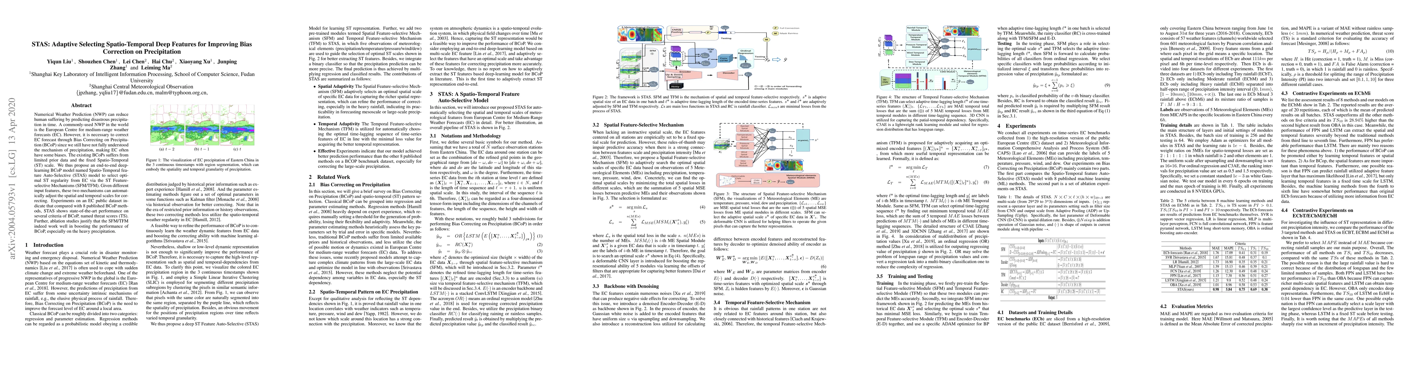 Numerical Weather Prediction (NWP) can reduce human suffering by predicting disastrous precipitation in time. A commonly-used NWP in the world is the European Centre for medium-range weather forecasts (EC). However, it is necessary to correct EC forecast through Bias Correcting on Precipitation (BCoP) since we still have not fully understood the mechanism of precipitation, making EC often have some biases. The existing BCoPs suffers from limited prior data and the fixed Spatio-Temporal (ST) scale. We thus propose an end-to-end deep-learning BCoP model named Spatio-Temporal feature Auto-Selective (STAS) model to select optimal ST regularity from EC via the ST Feature-selective Mechanisms (SFM/TFM). Given different input features, these two mechanisms can automatically adjust the spatial and temporal scales for correcting. Experiments on an EC public dataset indicate that compared with 8 published BCoP methods, STAS shows state-of-the-art performance on several criteria of BCoP, named threat scores (TS). Further, ablation studies justify that the SFM/TFM indeed work well in boosting the performance of BCoP, especially on the heavy precipitation.