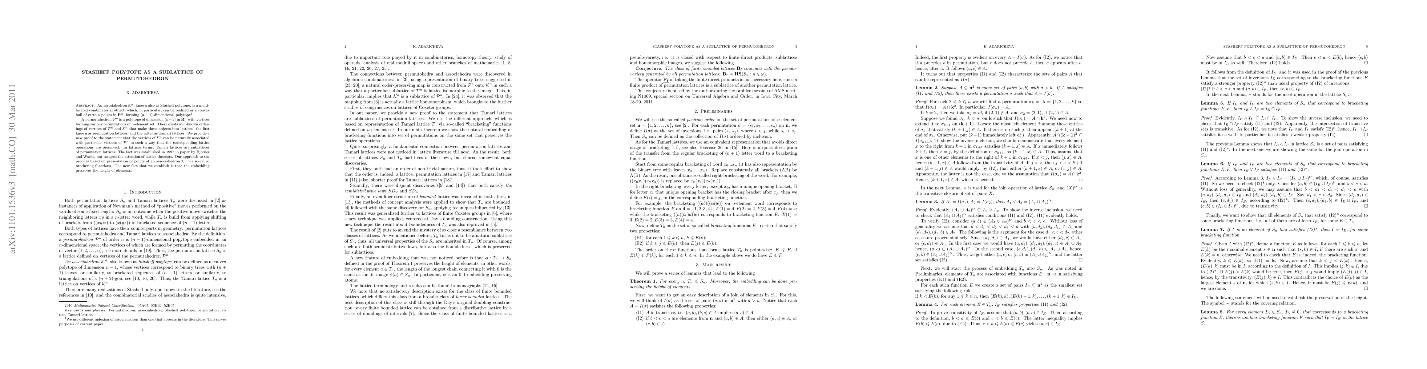 An assosiahedron $\mathcal{K}^n$, known also as Stasheff polytope, is a multifaceted combinatorial object, which, in particular, can be realized as a convex hull of certain points in $\mathbf{R}^{n}$, forming $(n-1)$-dimensional polytope. A permutahedron $\mathcal{P}^n$ is a polytope of dimension $(n-1)$ in $\mathbf{R}^{n}$ with vertices forming various permutations of $n$-element set. There exist well-known orderings of vertices of $\mathcal{P}^n$ and $\mathcal{K}^n$ that make these objects into lattices: the first known as permutation lattices, and the latter as Tamari lattices. We establish that the vertices of $\mathcal{K}^n$ can be naturally associated with particular vertices of $\mathcal{P}^n$ in such a way that the corresponding lattice operations are preserved. In lattices terms, Tamari lattices are sublattices of permutation lattices. More generally, this defines the application of associative law as a special form of permutation.
