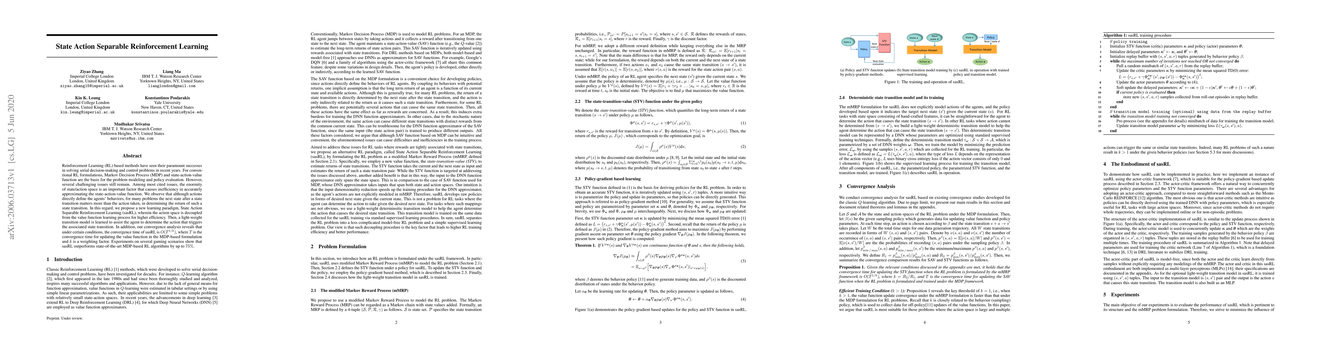This paper proposes State Action Separable Reinforcement Learning (sasRL) to address the inefficiencies of conventional RL in large state/action spaces. sasRL decouples the action space from the value function learning, using a lightweight transition model to determine effective actions, and demonstrates faster convergence and superior performance in gaming scenarios compared to traditional MDP-based RL methods.