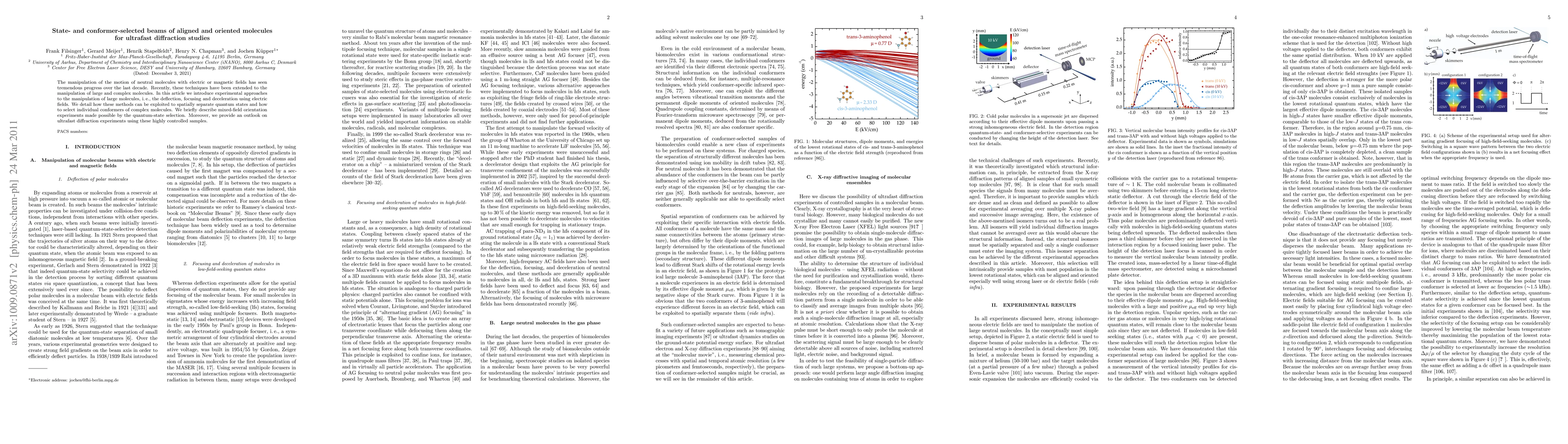 This paper discusses experimental techniques for manipulating large molecules using electric fields to deflect, focus, and decelerate them, enabling state- and conformer-selection for ultrafast diffraction studies. It also explores mixed-field orientation experiments and outlines future applications in ultrafast diffraction.